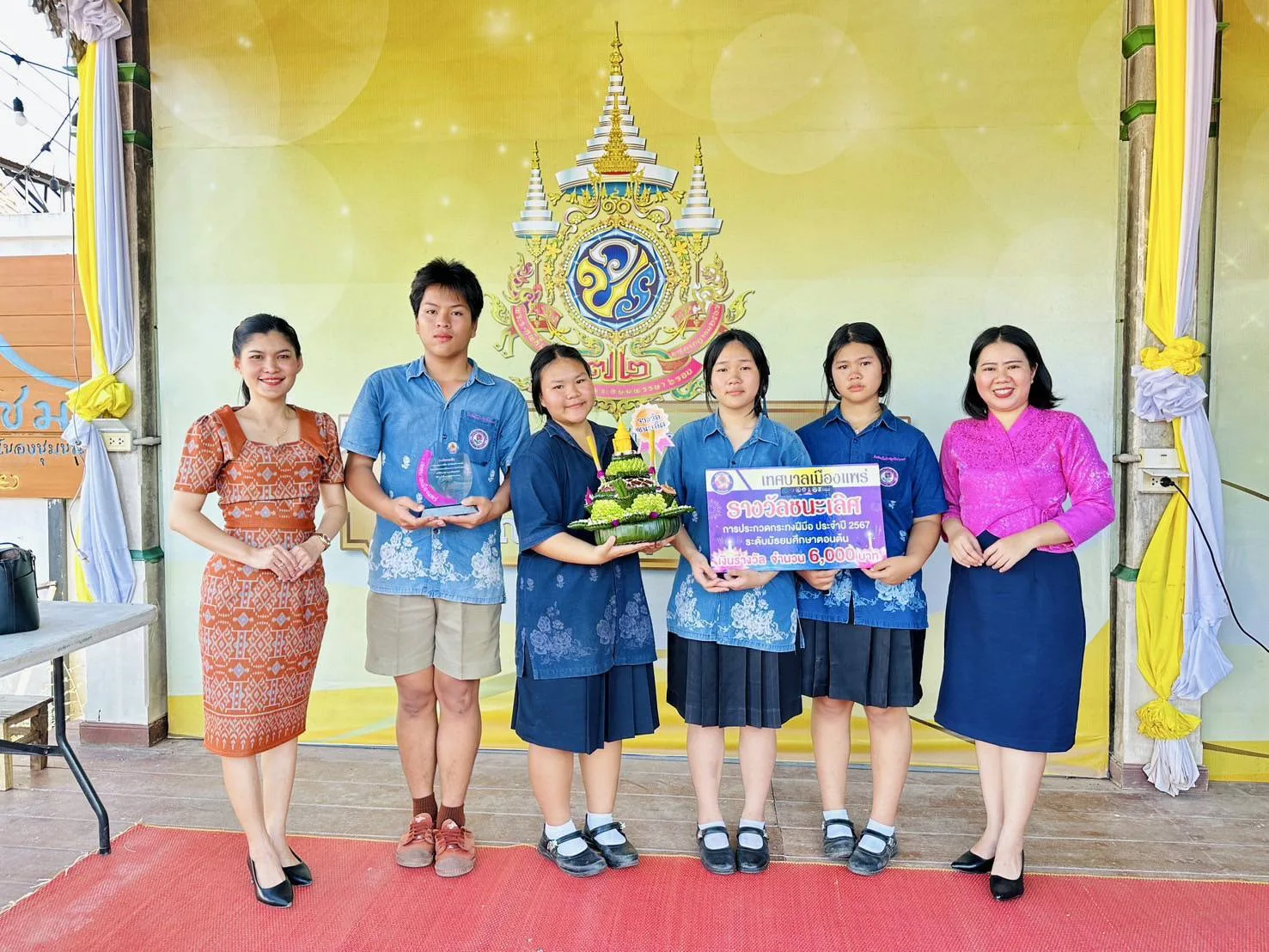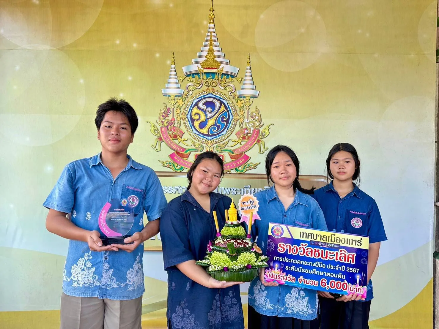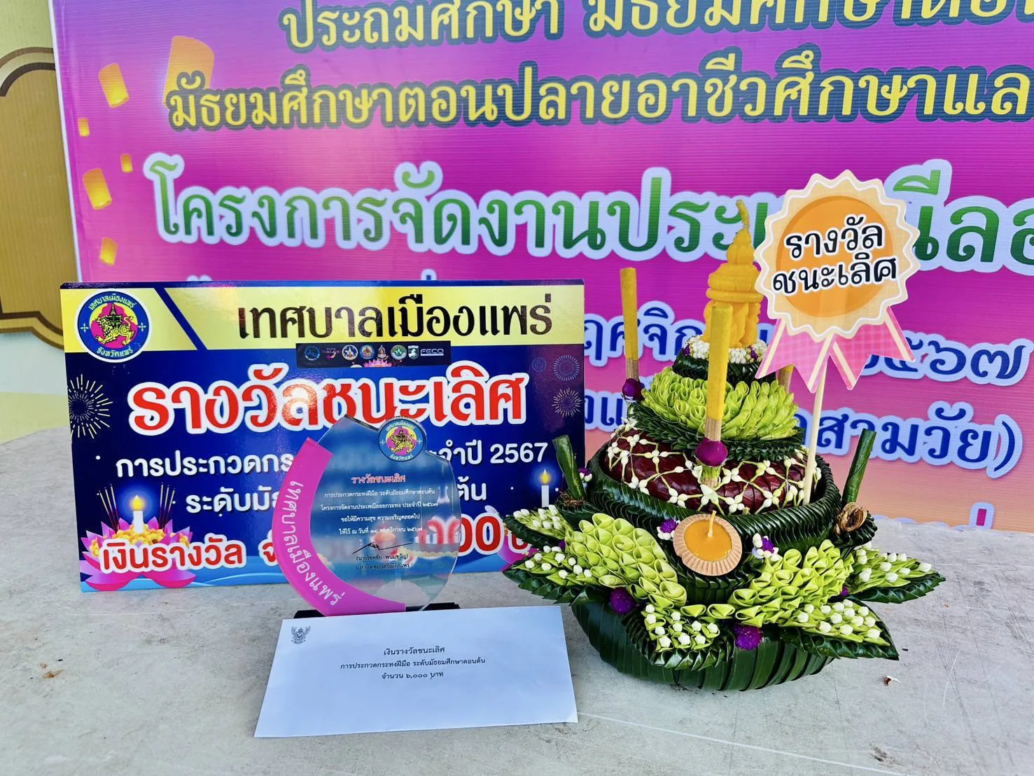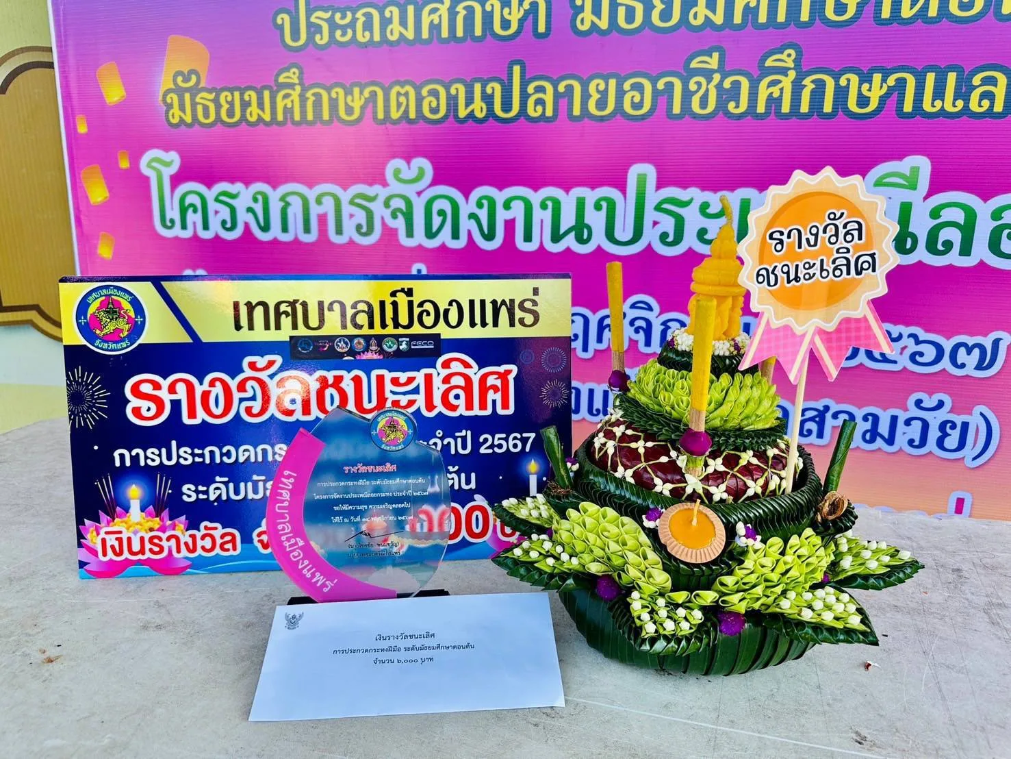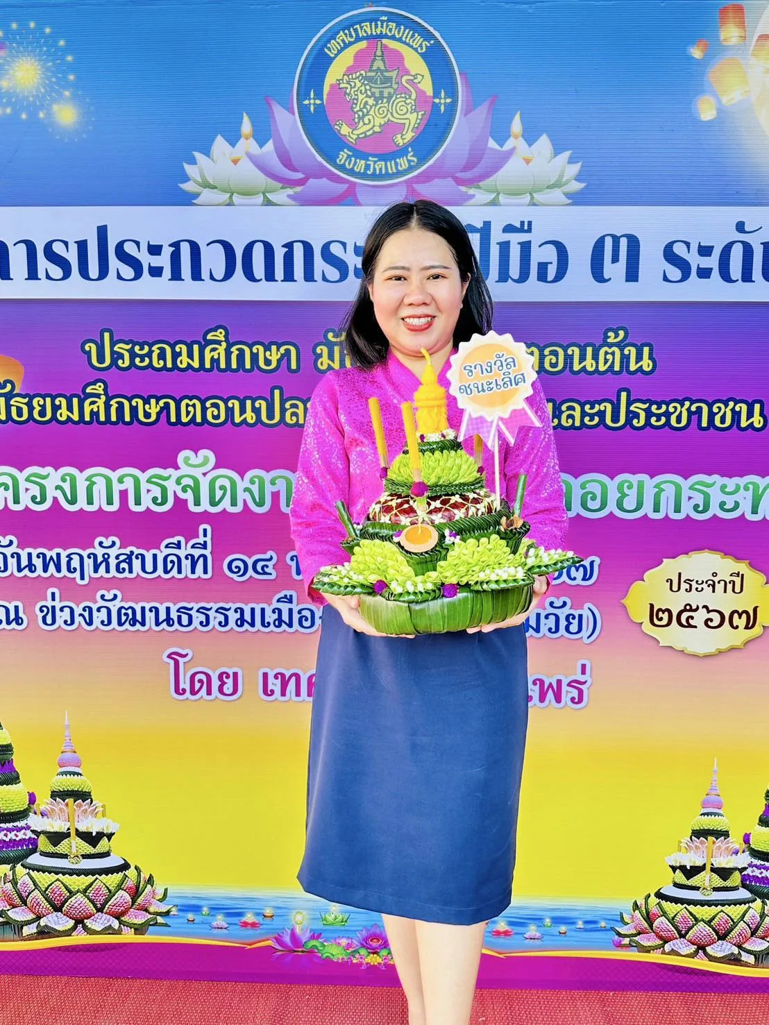 นางแสงเดือน คำมา ผอ.รร.วิไลเกียรติอุปถัมภ์ สพม.แพร่ เผยว่าตามที่ทางเทศบาลเมืองแพร่ได้จัดงานประเพณีลอยกระทง จุดผางปะตี้ปตื๋นก๋า ปูจาแม่กาเผือก ประจำปี 2567 ในระหว่างวันที่ 14-15 พฤศจิกายน 2567 ณ ข่วงวัฒนธรรมเมืองแป้ กาดสามวัย เพื่อส่งเสริมสืบทอด และรักษาไว้ซึ่งขนบธรรมเนียมประเพณีอันดีงามของไทย และส่งเสริมการท่องเที่ยวของจังหวัดแพร่ โรงเรียนวิไลเกียรติอุปถัมภ์ อ.เด่นชัย จังหวัดแพร่ สังกัดสำนักงานเขตพื้นที่การศึกษามัธยมศึกษาแพร่ จึงได้ส่งนักเรียนในระดับมัธยมศึกษาตอนต้น ร่วมเข้าแข่งขันการประกวดกระทงฝีมือ 3 ระดับ ระดับประถมศึกษา ระดับมัธยมศึกษาตอนต้น และ ระดับมัธยมศึกษาตอนปลาย ผลการประกวดได้รับรางวัลชนะเลิศ โดยได้รับโล่รางวัล พร้อมเงินสด จำนวน 6,000 บาท จากเทศบาลเมืองแพร่ นักเรียนที่เข้าร่วมแข่งขันมีดังนี้