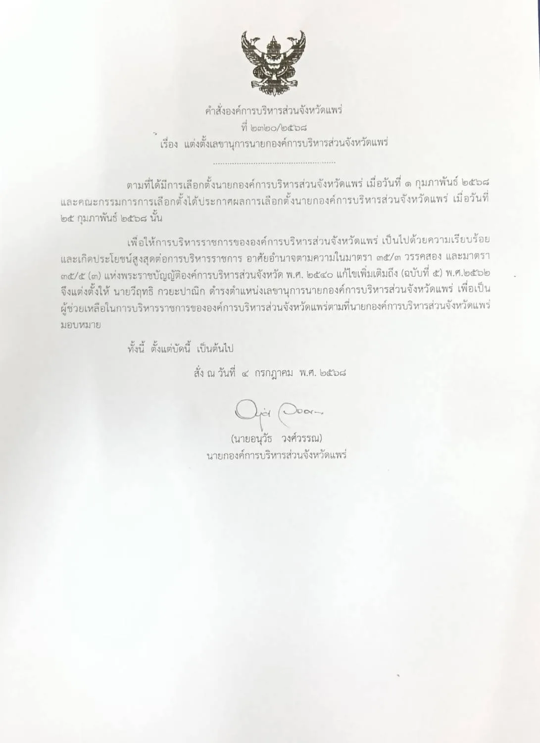 ผู้สื่อข่าวรายงานว่า ได้มีคำสั่งองค์การบริหารส่วนจังหวัดแพร่ ที่ 2320/2568 เรื่อง แต่งตั้งเลขานุการนายกองค์การบริหารส่วนจังหวัดแพร่ ความว่า