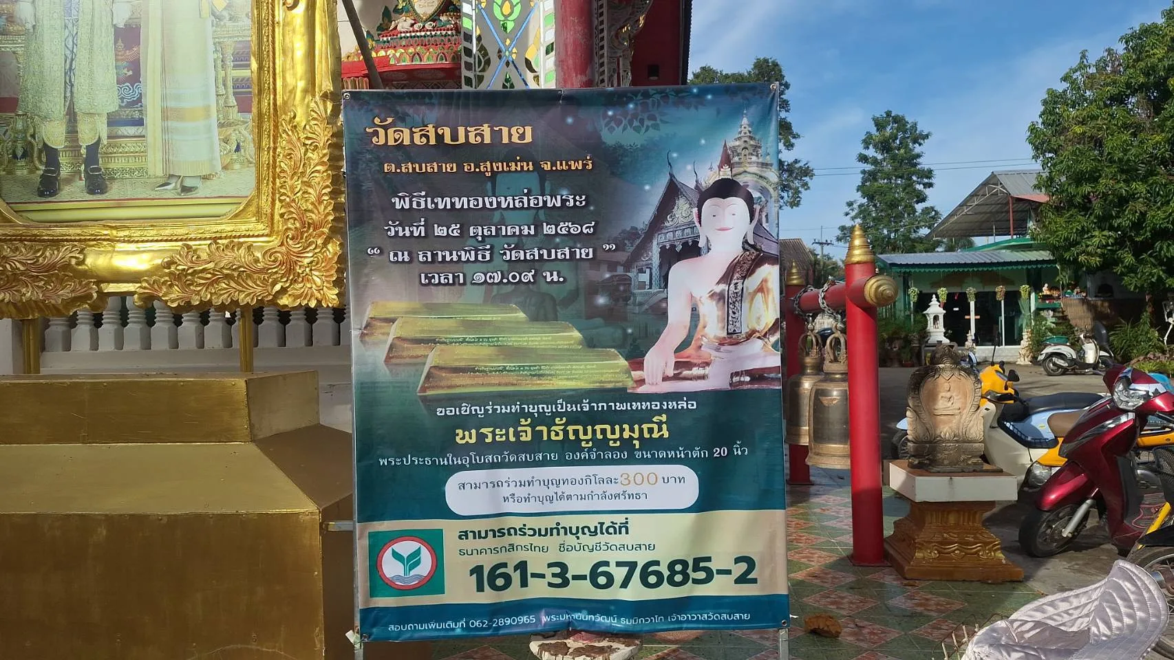 พุทธศาสนิกชนผู้ใจบุญสามารถร่วมทำบุญทองกิโลกรัมละ 300 บาท หรือทำบุญได้ตามกำลังศรัทธา วัดสบสายพร้อมด้วยคณะศรัทธา ตำบลสบสาย ตำบลสบสาย อำเภอสูงเม่น จังหวัดแพร่