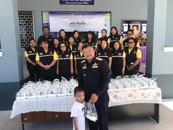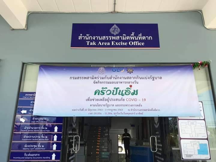 วันที่ 22 มิถุนายน 2563 นายอำคา ยอดโพธิ์ สรรพสามิตพื้นที่ตาก พร้อมด้วยข้าราชการ พนักงานและลูกจ้าง สำนักงานสรรพสามิตพื้นที่ตาก ได้ปฏิบัติตามนโยบายของรัฐบาล และกระทรวงการคลัง โดยกรมสรรพสามิตร่วมกับสำนักงานสลากกินแบ่งรัฐบาล จัดกิจกรรมมอบอาหารกลางวัน “ครัวปันอิ่ม” เพื่อช่วยเหลือผู้ประสบภัย COVID – 19 ได้มอบข้าวกล่องและน้ำดื่ม จำนวน 150 กล่องต่อวัน ระหว่างวันที่ 22 มิถุนายน 2563 – 3 กรกฎาคม 2563 เป็นเวลา 10 วันทำการ ณ สำนักงานสรรพสามิตพื้นที่ตาก เวลา 9.00 น. – 12.00 น. ทุกวัน เว้นวันหยุดเสาร์-อาทิตย์