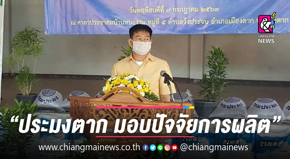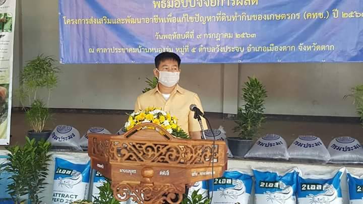 วันที่ 9 กรกฎาคม 2563 สำนักงานประมงจังหวัดตาก จัดพิธีมอบปัจจัยการผลิต โครงการส่งเสริมและพัฒนาอาชีพ เพื่อแก้ไขปัญหาที่ดินทำกินของเกษตรกร พื้นที่ป่าประจำรักษ์ หมู่ที่ 5 และหมู่ที่ 7 ตำบลวังประจบ อำเภอเมืองตาก จำนวน 47 ราย เพื่อส่งเสริมและพัฒนาอาชีพด้านการเพาะเลี้ยงสัตว์น้ำ โดยมีนายสมชาย ไตรทิพย์ชาติสกุล นายอำเภอเมืองตาก เป็นประธานในพิธี