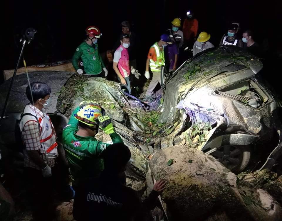ที่เกิดเหตุเป็นเส้นทางภูเขาสองข้างทางเต็มไปด้วยเหวลึก ที่แนวทางโค้งที่เต็มไปด้วยต้นไม้สูงชัน เจ้าหน้าที่พบกองดินภูเขาไหลสไลด์ลงมาบนเส้นทางโดยมีต้นไม้ขนาดใหญ่ล้มทับกลาง รถโตโยต้า สีบรอนซ์เงิน หมายเลขทะเบียนเชียงใหม่ สภาพรถพังยับเยิน มีซากต้นไม้ขนาดใหญ่ทั้งต้นล้มทับกลางคัน
