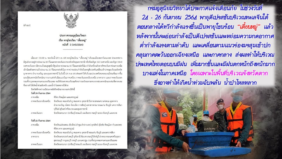 ตามที่กรมอุตุนิยมวิทยาได้ประกาศแจ้งเตือนภัย ในช่วงวันที่ 24 – 26 กันยายน 2564 พายุดีเปรสชันบริเวณทะเลจีนใต้ตอนกลางได้ทวีกำลังแรงขึ้นเป็นพายุโซนร้อน “เตี้ยนหมู่” แล้ว หลังจากนั้นจะอ่อนกำลังเป็นดีเปรสชันและหย่อมความกดอากาศต่ำกำลังแรงตามลำดับ และเคลื่อนตามแนวร่องมรสุมเข้าปกคลุมภาคตะวันออกเฉียงเหนือ และภาคกลาง ส่งผลทำให้บริเวณประเทศไทยตอนบนมีฝน เพิ่มมากขึ้นและมีฝนตกหนักถึงหนักมากบางแห่งในภาคเหนือ โดยเฉพาะในพื้นที่บริเวณจังหวัดตาก ซึ่งอาจทำให้เกิดน้ำท่วมฉับพลัน น้ำป่าไหลหลาก
