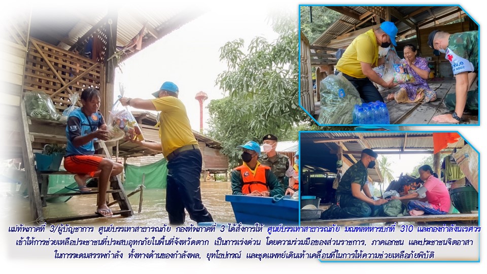 ในการนี้ แม่ทัพภาคที่ 3/ผู้บัญชาการ ศูนย์บรรเทาสาธารณภัย กองทัพภาคที่ 3 ได้สั่งการให้ ศูนย์บรรเทาสาธารณภัย มณฑลทหารบกที่ 310 และกองกำลังนเรศวร เข้าให้การช่วยเหลือประชาชนที่ประสบอุทกภัยในพื้นที่จังหวัดตาก เป็นการเร่งด่วน โดยความร่วมมือของส่วนราชการ, ภาคเอกชน และประชาชนจิตอาสา ในการระดมสรรพกำลัง ทั้งทางด้านของกำลังพล, ยุทโธปกรณ์ และชุดแพทย์เดินเท้าเคลื่อนที่ในการให้ความช่วยเหลือภัยพิบัติ ดังนี้.-