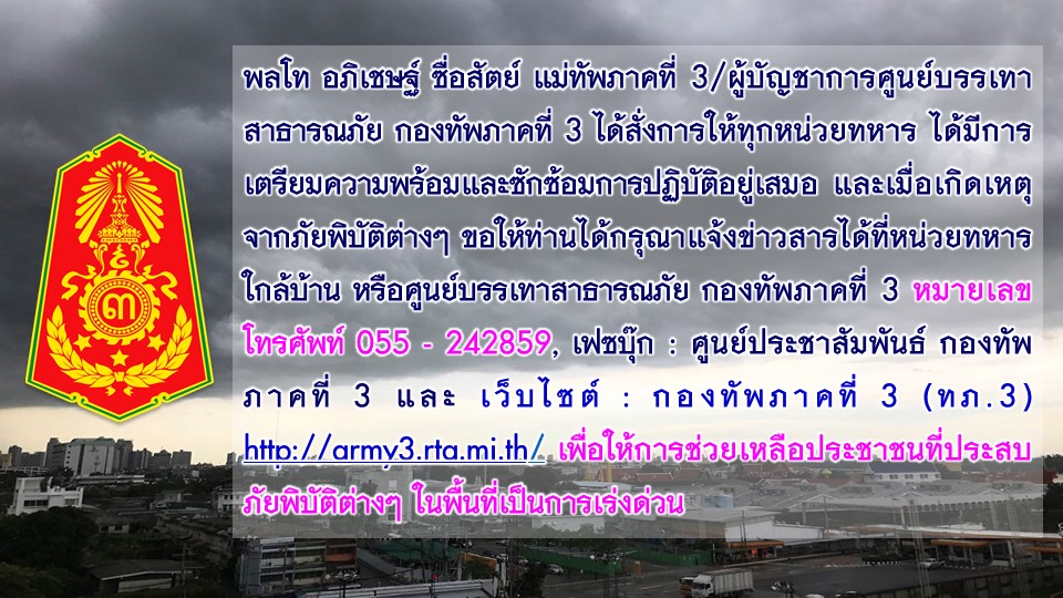ปัจจุบัน สถานการณ์อุทกภัยในจังหวัดตาก ได้คลี่คลายลงตามลำดับ แต่ศูนย์บรรเทาสาธารณภัย มณฑลทหารบกที่ 310 และกองกำลังนเรศวร ยังคงเฝ้าระวังและมีการเตรียมความพร้อมในการเข้าให้การช่วยเหลือประชาชนในพื้นที่อย่างต่อเนื่อง ทั้งนี้ พลโท อภิเชษฐ์ ซื่อสัตย์ แม่ทัพภาคที่ 3/ผู้บัญชาการศูนย์บรรเทาสาธารณภัย กองทัพภาคที่ 3 ได้สั่งการให้ทุกหน่วยทหาร ได้มีการเตรียมความพร้อมและซักซ้อมการปฏิบัติอยู่เสมอ และเมื่อเกิดเหตุจากภัยพิบัติต่างๆ ขอให้ท่านได้กรุณาแจ้งข่าวสารได้ที่หน่วยทหารใกล้บ้าน หรือศูนย์บรรเทาสาธารณภัย กองทัพภาคที่ 3 หมายเลขโทรศัพท์ 055 – 242859, เฟซบุ๊ก : ศูนย์ประชาสัมพันธ์ กองทัพภาคที่ 3 และ เว็บไซต์ : กองทัพภาคที่ 3 (ทภ.3) http://army3.rta.mi.th/ เพื่อให้การช่วยเหลือประชาชนที่ประสบภัยพิบัติเป็นการเร่งด่วนต่อไป