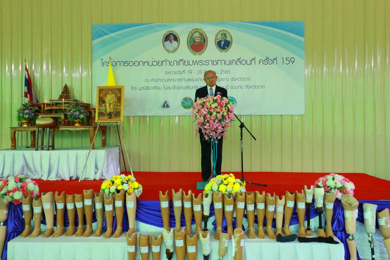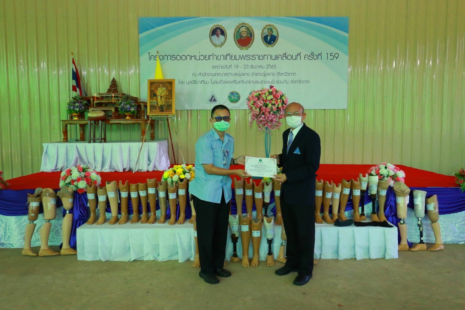 วันที่ 23 ธันวาคม 2565 ศาสตรจารย์คลินิก นายแพทย์นิเวศน์ นันทจิต เลขาธิการมูลนิธิขาเทียม ในสมเด็จพระศรีนครินทราบรมราชชนนี เป็นประธานในพิธีมอบขาเทียมพระราชทาน ในการออกหน่วยขาเทียมพระราชทานเคลื่อนที่ครั้งที่ 159 ระหว่างวันที่ 17-23 ธันวาคม 2565 ณ สำนักงานเทศบาลตำบลอุ้มผาง อ.อุ้มผาง จ.ตาก โดย นายแพทย์วรวิทย์ ตันติวิวัฒนทรัพย์ ผู้อำนวยการโรงพยาบาลอุ้มผาง นายกเทศมนตรีตำบลอุ้มผาง สาธารณสุขอำเภออุ้มผาง นายกองค์การบริหารส่วนตำบลอุ้มผาง และหัวหน้าส่วนราชการ ให้เกียรติร่วมในพิธี ทั้งนี้มีคนพิการขาขาดในจังหวัดตากและพื้นที่ใกล้เคียงเข้ารับบริการทำขาเทียมพระราชทานทั้งหมดเกือบ 60 ราย โดยมีคณะผู้บริหาร เจ้าหน้าที่ และอาสาสมัครมูลนิธิขาเทียมฯ ให้การต้อนรับ