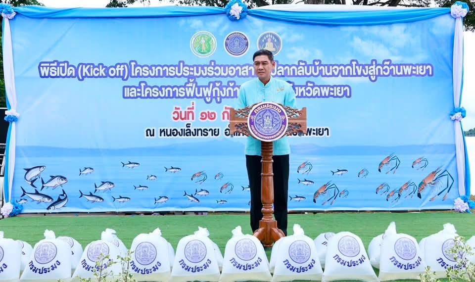 วันศุกร์ที่ 12 กันยายน 2568 เวลา 09.30 น. นายรัฐพล นราดิศร ผู้ว่าราชการจังหวัดพะเยา เป็นประธานในพิธีเปิด (Kick off) โครงการประมงร่วมอาสาพาปลากลับบ้านจากโขงสู่กว๊านพะเยา และโครงการฟื้นฟูกุ้งก้ามกรามในจังหวัดพะเยา ซึ่งการจัดกิจกรรมในวันนี้ ได้มีการปล่อยพันธุ์ปลาที่ได้จากการเพาะพันธุ์ด้วยชุดเพาะฟักเคลื่อนที่ (Mobile Hatchery) ได้แก่ ปลาตะเพียนขาว จำนวน 15 ล้านตัว ปลากระแห จำนวน 5 ล้านตัว รวมทั้งสิ้น 20 ล้านตัว และกุ้งก้ามกราม จำนวน 1 แสนตัว ปล่อยสู่หนองเล็งทรายเพื่อเพิ่มความหลากหลายทางชีวภาพในระบบนิเวศทางน้ำ ฟื้นฟูแหล่งอาหารธรรมชาติ และสร้างรายได้ให้กับชาวประมงในพื้นที่ โดยมี หัวหน้าส่วนราชการในสังกัดกระทรวงเกษตรและสหกรณ์จังหวัดพะเยา ผู้แทนนายอำเภอแม่ใจ นายกเทศมนตรีตำบลแม่ใจ และกำนัน ผู้ใหญ่บ้าน เข้าร่วมในพิธี