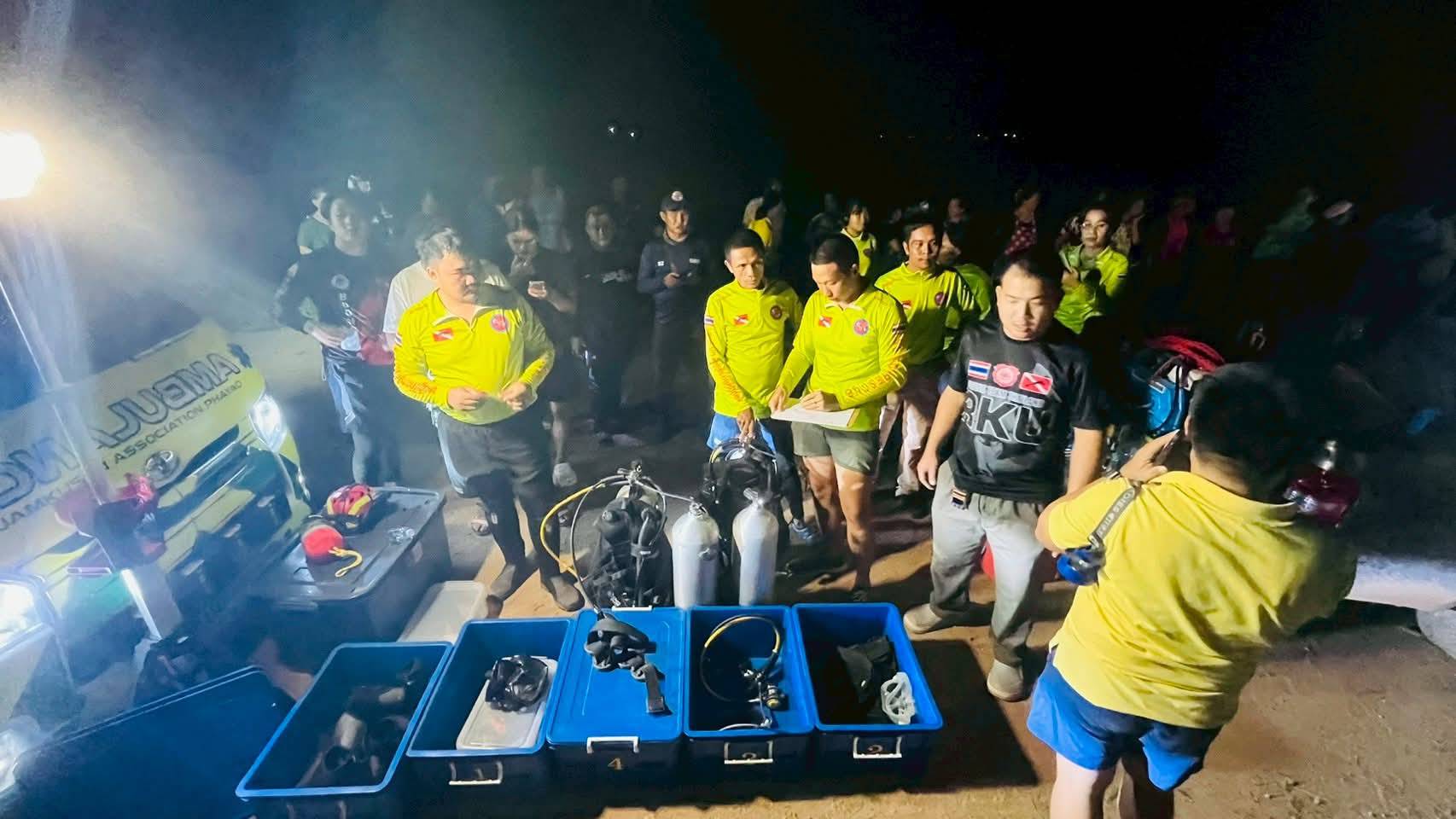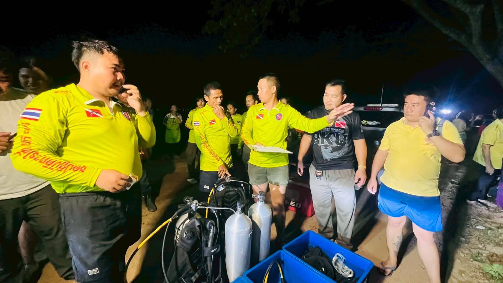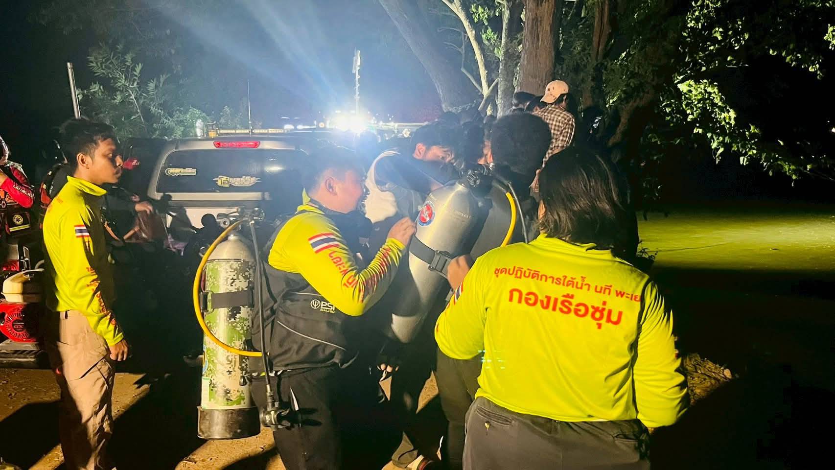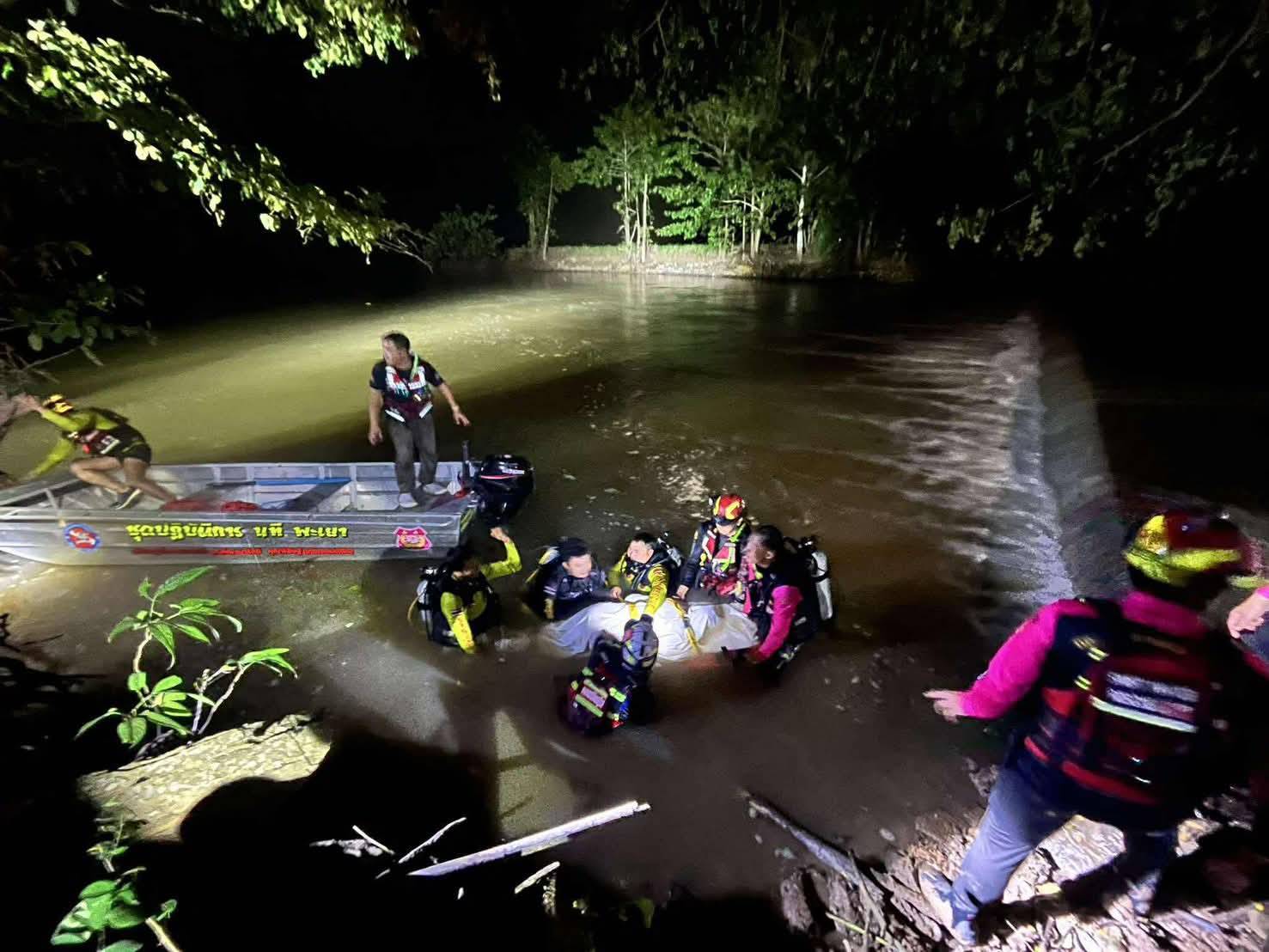 เจ้าหน้าที่กู้ภัยจึงระดมกำลังนำเรือยนต์และอุปกรณ์ดำน้ำลงงมค้นหา ใช้เวลาประมาณ 2 ชั่วโมง จึงพบร่างผู้สูญหายเสียชีวิตอยู่ใต้น้ำ และสุนัขติดอยู่ที่รากไม้ ห่างจากจุดพลัดตกประมาณ 15-20 ม. โดยผู้เสียชีวิตสวมเสื้อยืดและกางเกงกีฬา