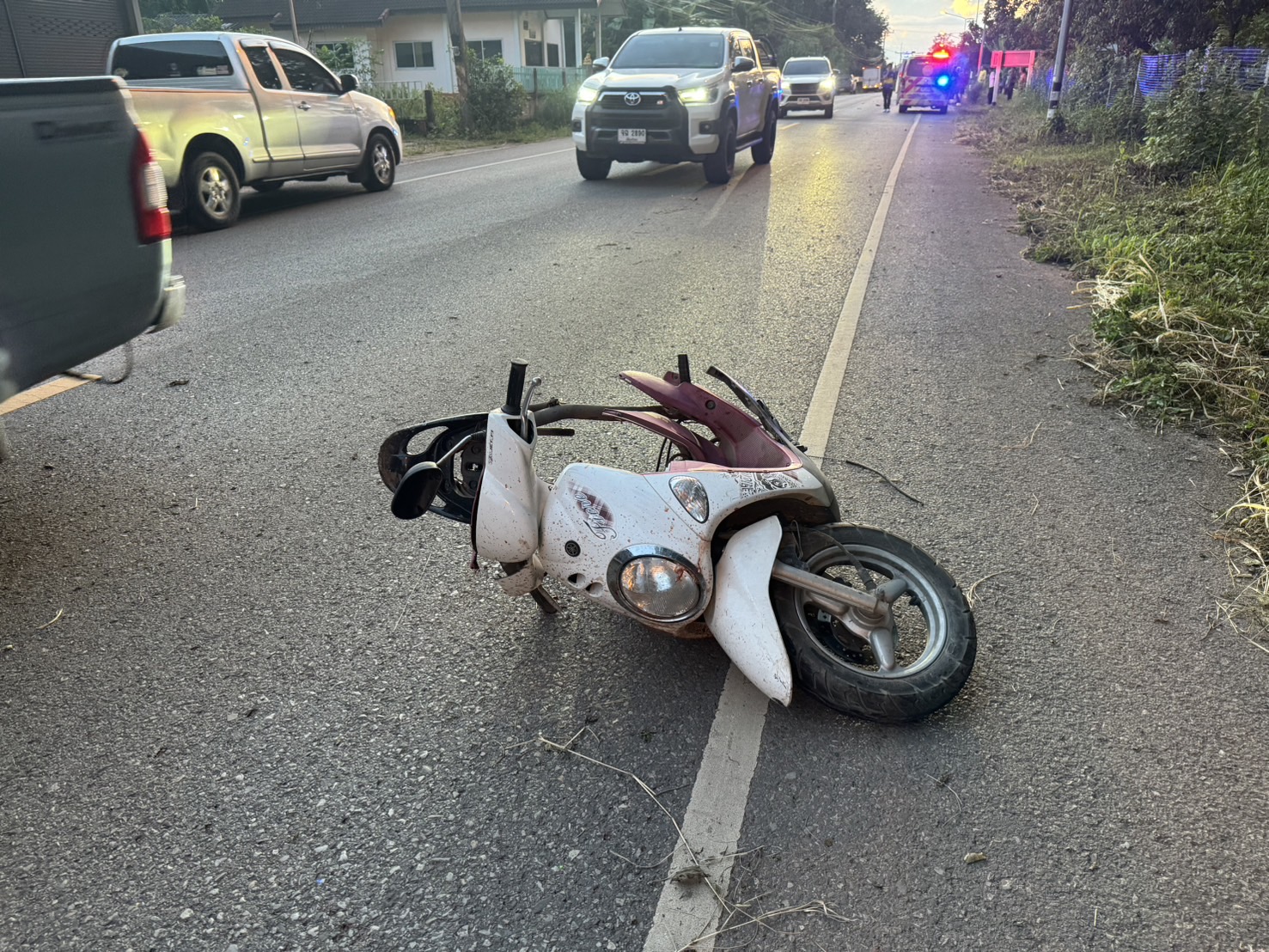 เมื่อไปถึงที่เกิดเหตุพบรถกระบะยี่ห้ออีซูซุ สีดำ ป้ายทะเบียนเชียงราย สภาพด้านซ้ายหน้าพังยับ ส่วนคนขับคือ น.ส.วิมลสิริ (สงวนนามสกุล) อายุ 41 ปี เป็นชาว อ.แม่สาย จ.เชียงราย พูดจาเมาไม่ได้สติอยู่ภายในรถยนต์ ไม่ไกลกันนั้นพบร่างของ ร.ต.ต.ทวีพงษ์ เป็นตำรวจชุดสืบสวน นอนแน่นิ่งไร้ลมหายใจสภาพร่างกายเสื้อผ้าขาดเกือบทั่วตัว และยังพบรถจักรยานยนต์ไม่ทราบรุ่น ป้ายทะเบียนพะเยา สภาพขาด 2 ท่อนอยู่กลางถนน ทั้งนี้เจ้าหน้าที่กู้ภัยและแพทย์เวรช่วยกันดูสภาพของนายตำรวจก็พบว่าสิ้นลมหายใจไปแล้วโดยร่างกายกระดูกหักหลายที่รวมทั้งบริเวณตรงศีรษะสมองแตก