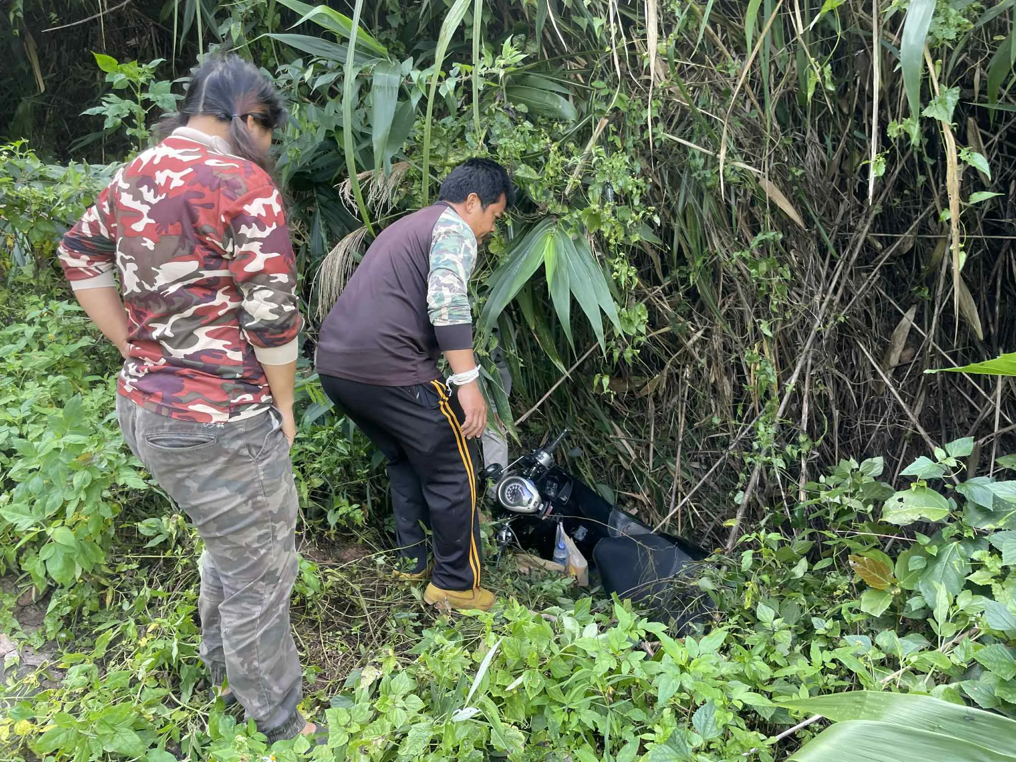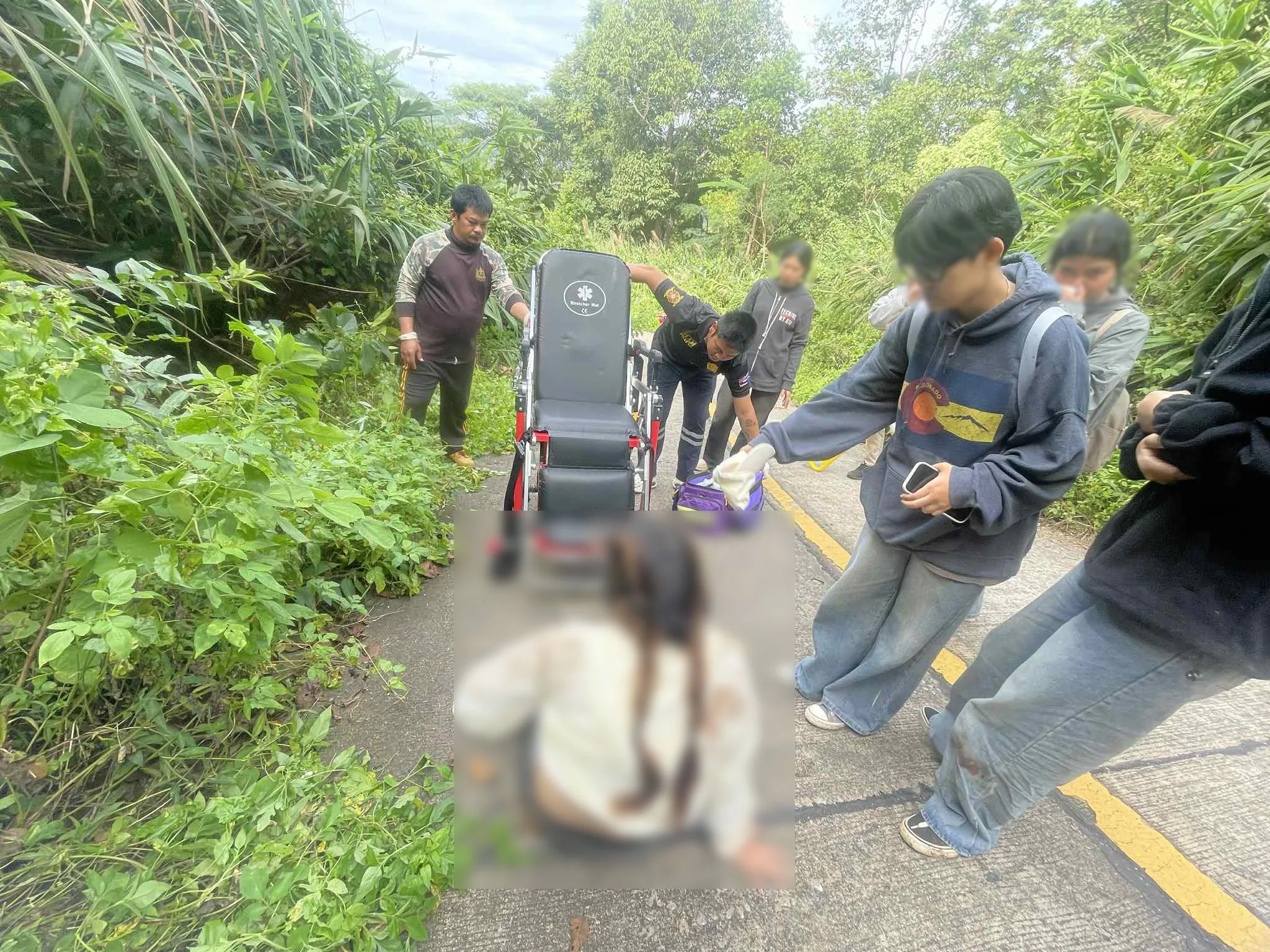 เมื่อไปถึงที่เกิดเหตุพบเป็นถนนขาลงลาดชันโดยมีกลุ่มวัยรุ่นรอเจ้าหน้าที่เข้าช่วยเหลือ ทั้งนี้ผู้ประสบเหตุทราบชื่อต่อมาคือ น.ส.ปพิชญา อายุ 19 ปี ชาว จ.เพชรบูรณ์ ได้รับบาดเจ็บไหปลาร้าแขนขวาหักและ น.ส.ชลกร อายุ 19 ปี ชาวกรุงเทพฯ หมดสติไปประมาณ 10 นาที ซึ่งทั้ง 2 เป็นนักศึกษาของ ม.พะเยา ทั้งนี้เจ้าหน้าที่กู้ภัยจึงเร่งนำตัวส่ง รพ.เชียงคำ เป็นการด่วนโดยมีเจ้าหน้าที่ อช.ถ้ำสะเกิน คอยช่วยเหลืออีกแรง