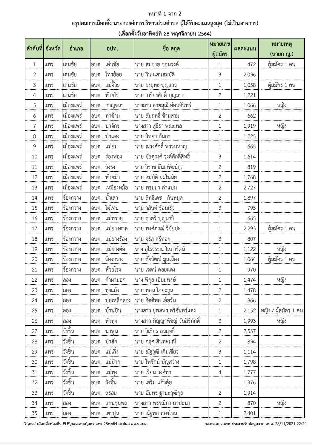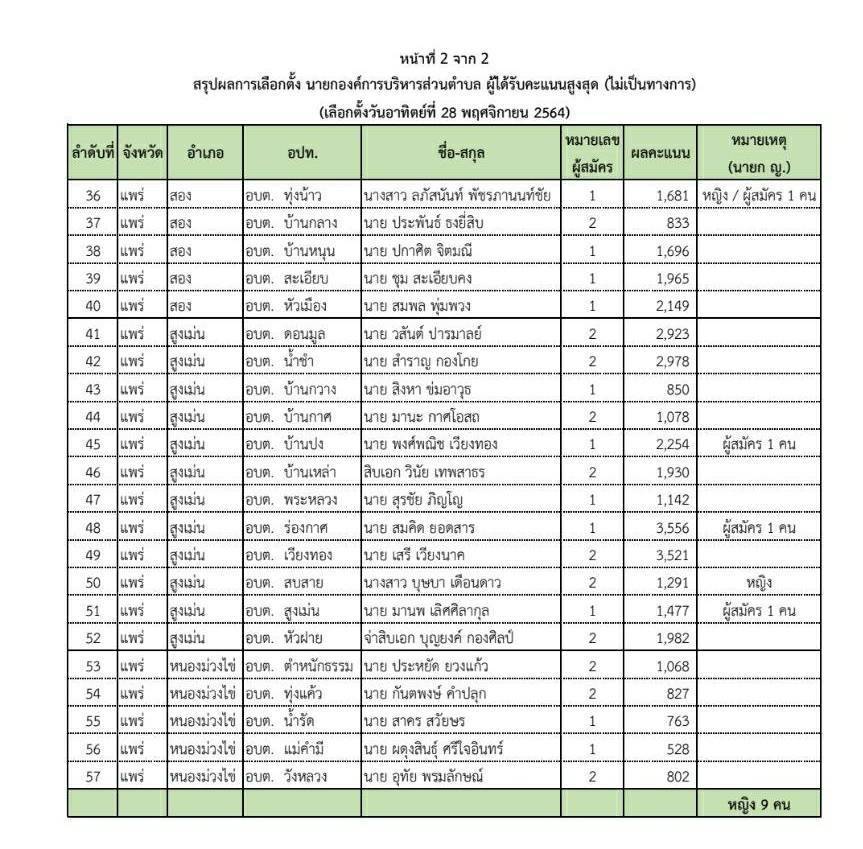 ผลคะแนนว่าที่นายก อบต. 57 แห่งของจ.แพร่อย่างไม่เป็นทางการ สมคิด ยอดสาร คะแนนมากสุด ส่วนว่าที่นายกอบต.หัวทุ่ง อายุน้อยสุด