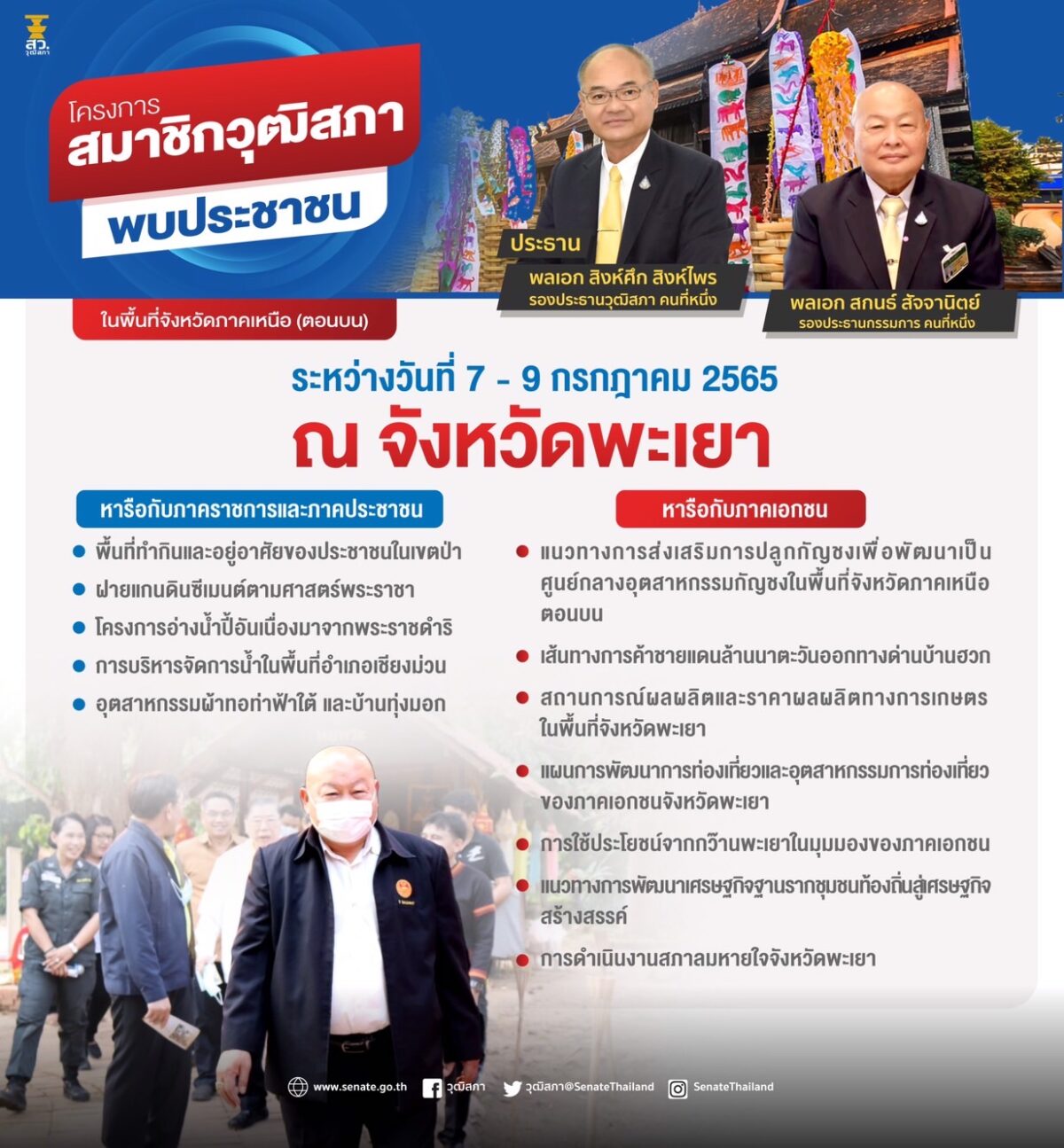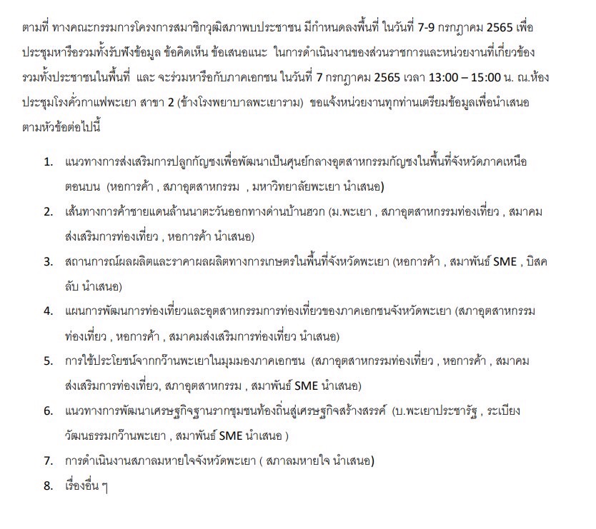 วันที่ 7 กรกฎาคม 2565 เวลา 13.00 -16.00 น.ภาคเอกชนจังหวัดพะเยา เข้าร่วมประชุมแสดงความคิดเห็นใน “โครงการสมาชิกวุฒิสภาพบปะประชาชน ในพื้นที่จังหวัดภาคเหนือ (ตอนบน)” ณ ห้องประชุม โรงคั่วกาแฟพะเยา สาขา 2 โดยภาคเอกชนได้เสนอความคิดเห็นต่อคณะวุฒิสมาชิด 6 ข้อ โดยในข้อที่ 4 ท่านวุฒิสมาชิกฯ ได้มอบหมายให้ มหาวิทยาลัยพะเยา เป็นเจ้าภาพในการบูรณาการกว๊านพะเยา ซึ่งเรื่องนี้ทางภาคเอกชนจะได้ติดตามเพื่อรายงานผลให้ทราบต่อไป