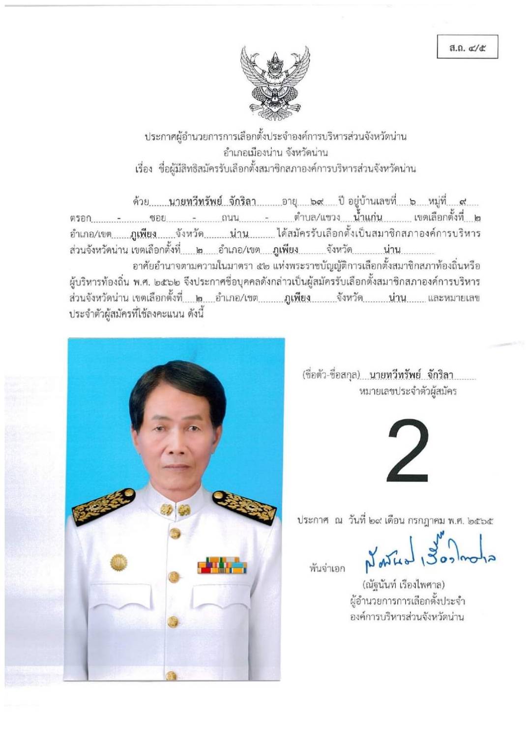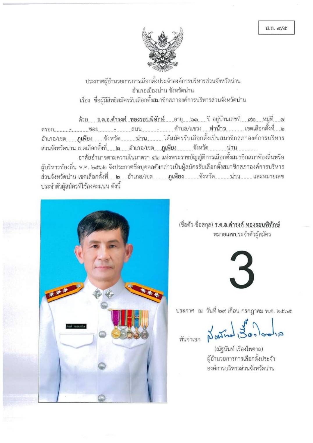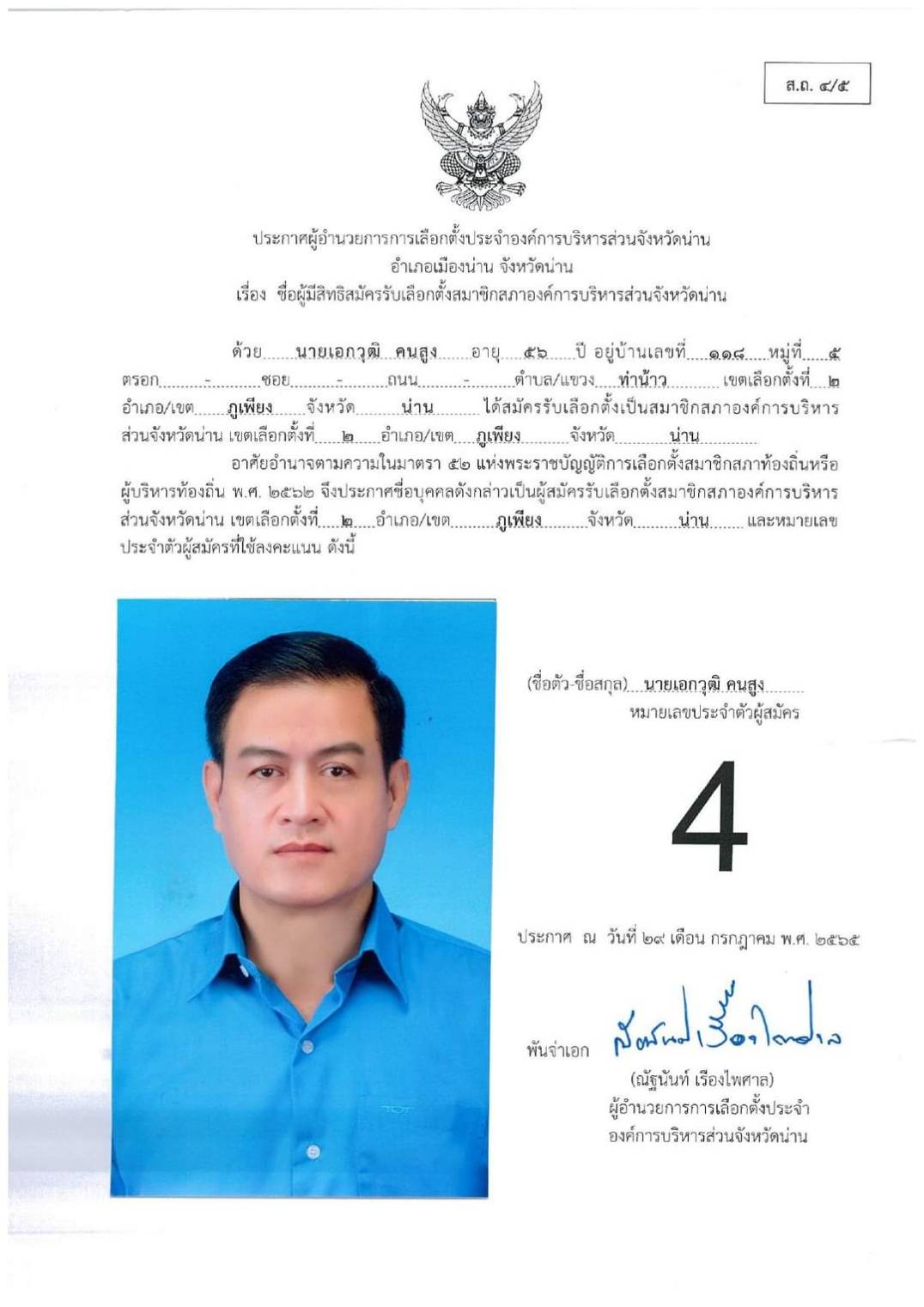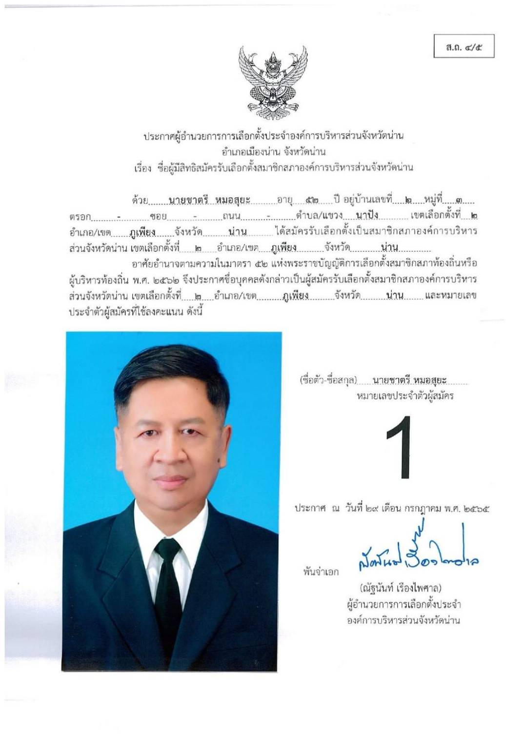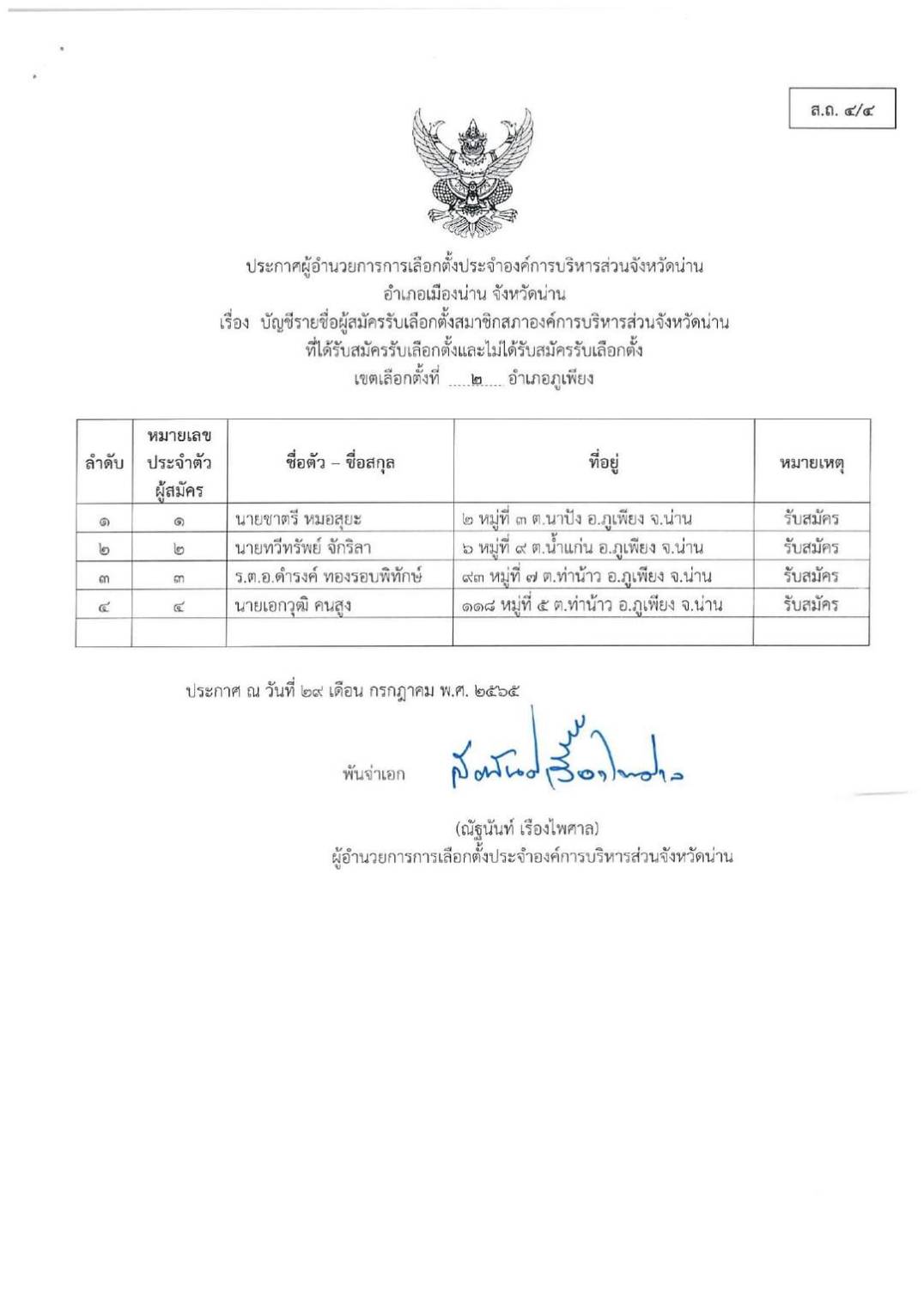 อบจ.น่าน ประกาศรายชื่อผู้ลง เขตเลือกตั้งที่ 2 อำเภอภูเพียง แทนตำแหน่งที่ว่าง