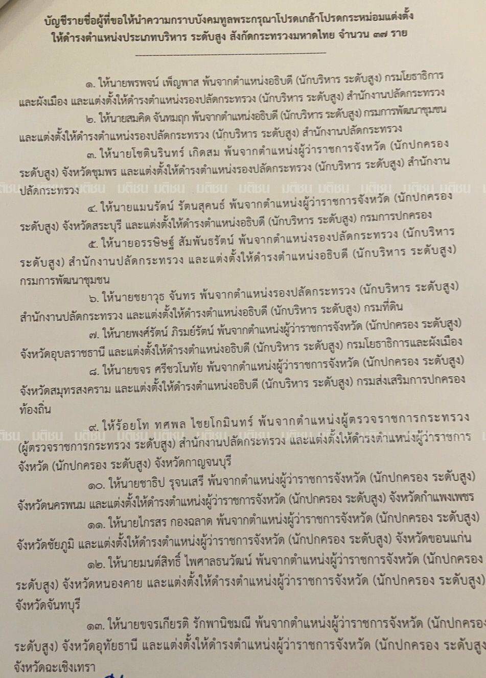 - ให้นายสยาม ศิริมงคล พ้นจากตำแหน่งผู้ว่าราชการจังหวัด (นักปกครอง ระดับสูง)จังหวัดอุดรธานี และแต่งตั้งให้ดำรงตำแหน่งผู้ว่าราชการจังหวัด (นักปกครอง ระดับสูง)จังหวัดนครราชสีมา