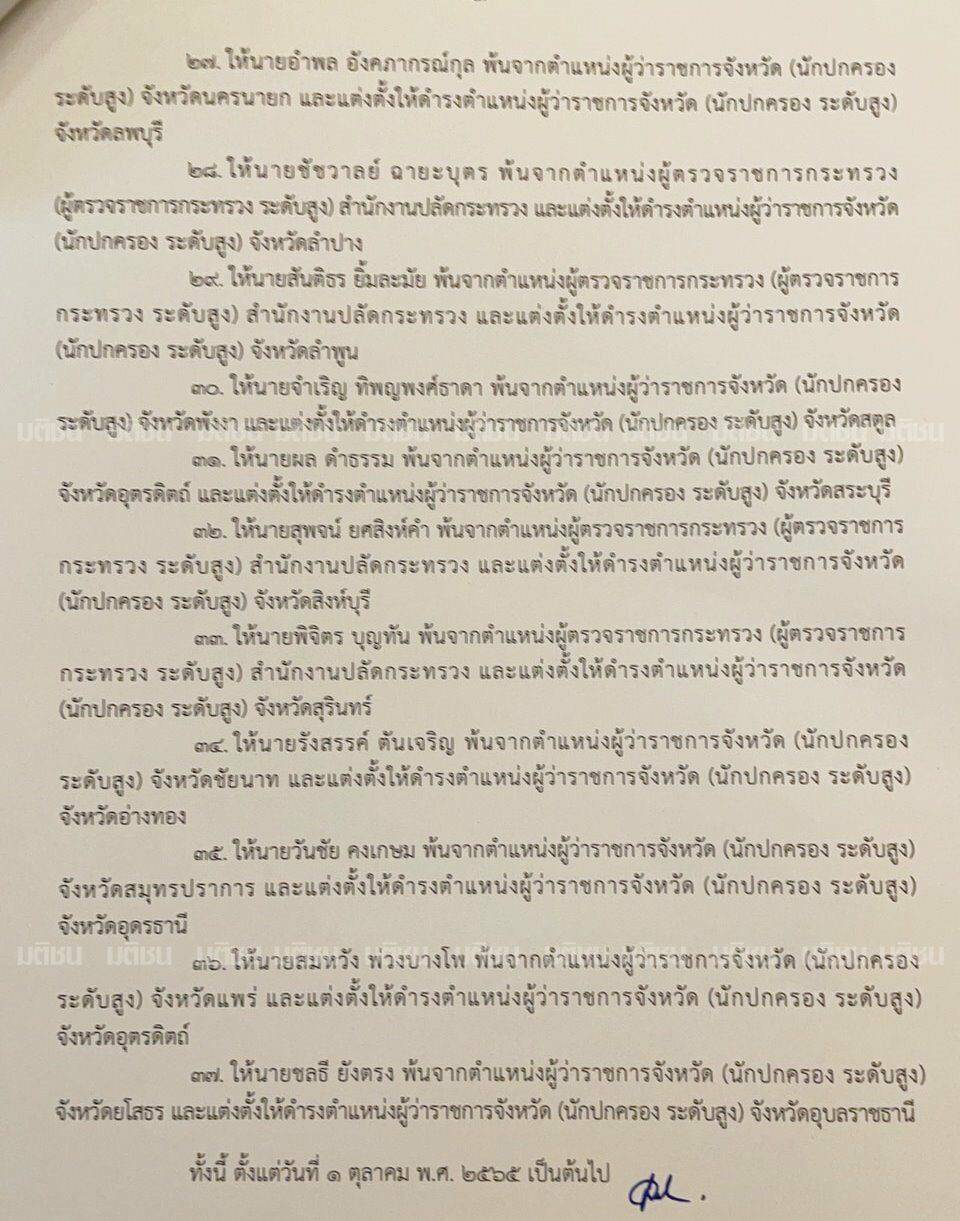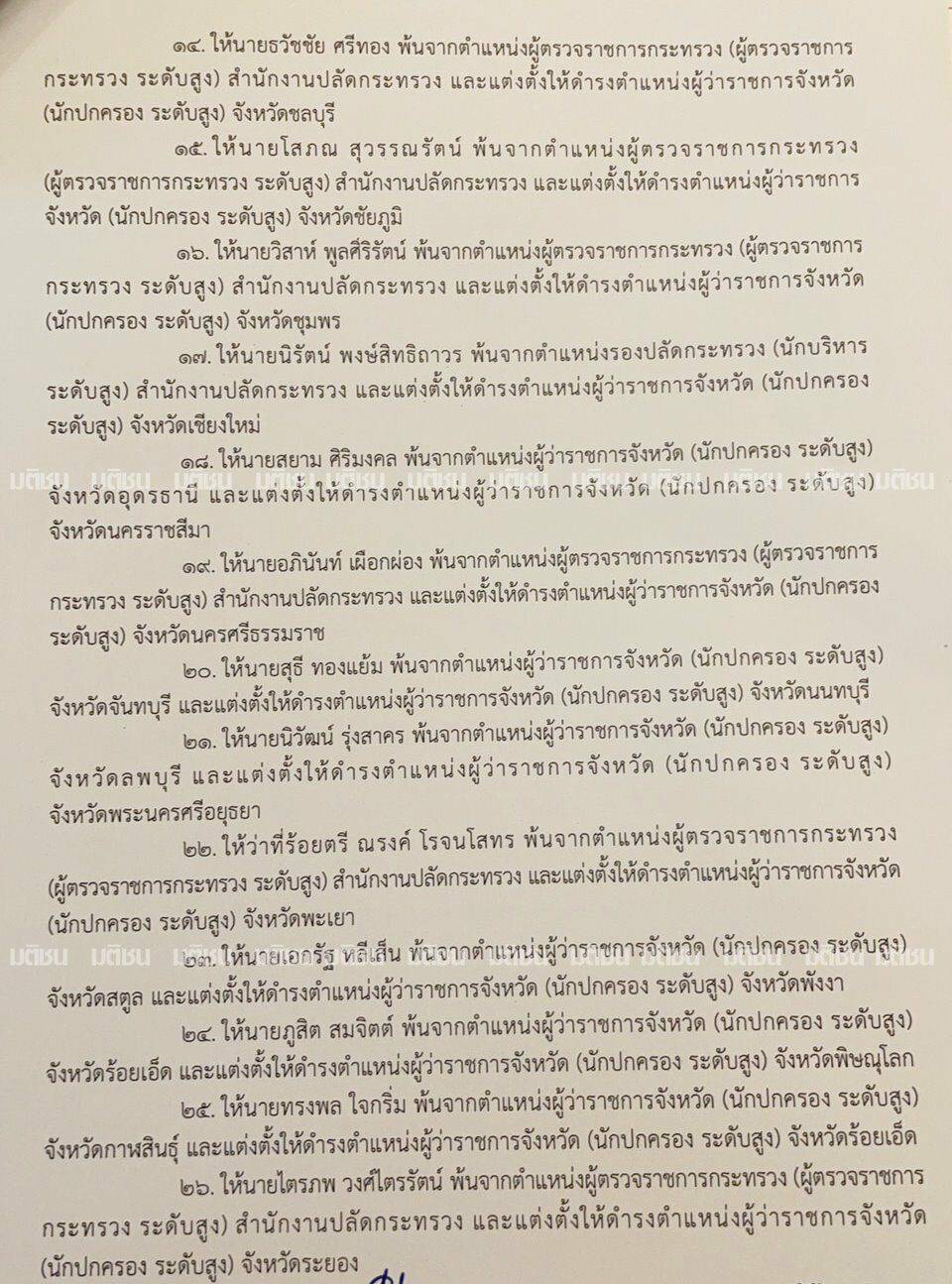 - ให้นายธวัชชัย ศรีทอง พ้นจากตำแหน่งผู้ตรวจราชการกระทรวง (ผู้ตรวจราชการกระทรวง ระดับสูง) สำนักงานปลัดกระทรวง และแต่งตั้งให้ดำรงตำแหน่งผู้ว่าราชการจังหวัด(นักปกครอง ระดับสูง) จังหวัดชลบุรี