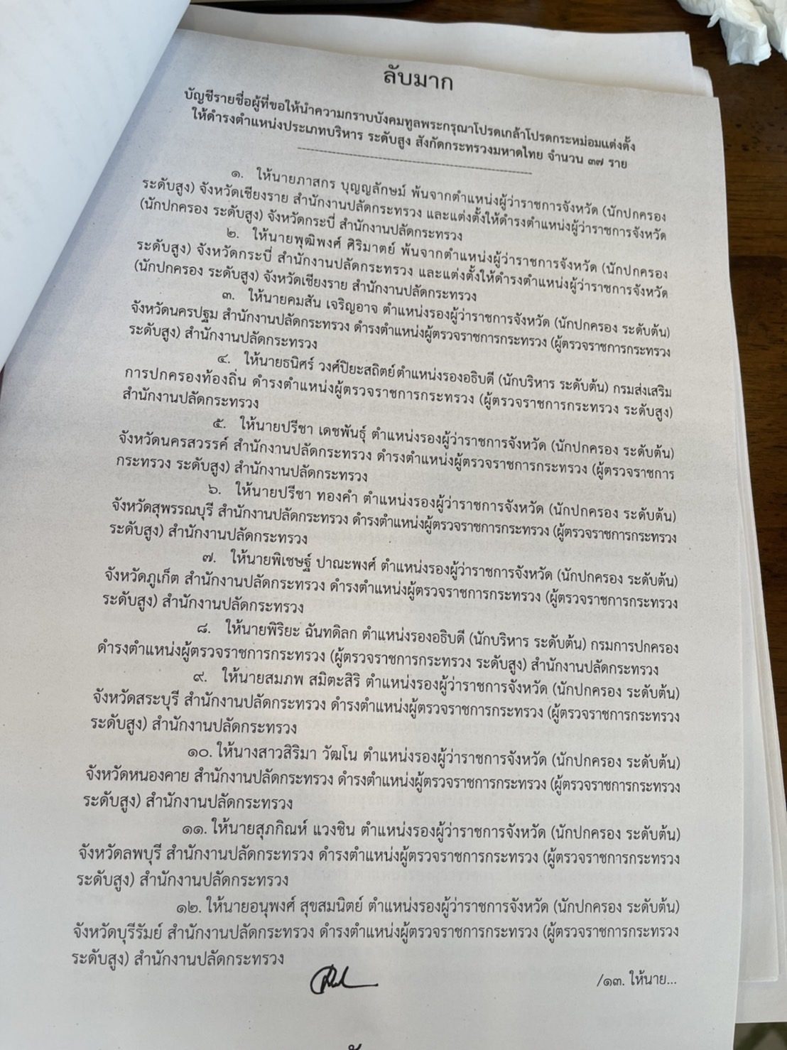 ผู้สื่อข่าวรายงานว่า เมื่อวันอังคารที่ 15 พฤศจิกายน พ.ศ. 2565 ในการประชุมคณะรัฐมนตรี (ครม.) พล.อ.อนุพงษ์ เผ่าจินดา รมว.มหาดไทย จะเสนอแต่งตั้งข้าราชการระดับสูง สังกัดกระทรวงมหาดไทย เป็นวาระจร ตามที่ นายสุทธิพงษ์ จุลเจริญ ปลัดกระทรวงมหาดไทย เสนอบัญชีรายชื่อแต่งตั้งแทนตำแหน่งที่ว่าง ประกอบด้วย ผู้ว่าราชการจังหวัด และผู้ตรวจราชการกระทรวงมหาดไทย รวมทั้งหมด 37 ตำแหน่ง โดยโผการแต่งตั้งได้หลุดเผยแพร่ตามสื่อมวลชนไปแล้ว