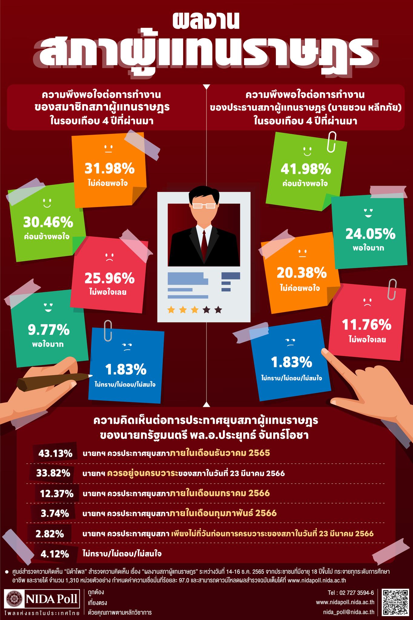 ศูนย์สำรวจความคิดเห็น “นิด้าโพล” สถาบันบัณฑิตพัฒนบริหารศาสตร์ (นิด้า) เปิดเผยผลสำรวจของประชาชน เรื่อง “ผลงานสภาผู้แทนราษฎร” ทำการสำรวจระหว่างวันที่ 14-16 ธันวาคม 2565 จากประชาชนที่มีอายุ 18 ปีขึ้นไป กระจายทุกภูมิภาค ระดับการศึกษา อาชีพ และรายได้ ทั่วประเทศ รวมทั้งสิ้น จำนวน 1,310 หน่วยตัวอย่าง เกี่ยวกับการทำงานของสมาชิกสภาผู้แทนราษฎรและประธานสภาผู้แทนราษฎร (นายชวน หลีกภัย) ในรอบเกือบ 4 ปีที่ผ่านมา การสำรวจอาศัยการสุ่มตัวอย่างโดยใช้ความน่าจะเป็นจากบัญชีรายชื่อฐานข้อมูลตัวอย่างหลัก (Master Sample) ของ “นิด้าโพล” สุ่มตัวอย่างด้วยวิธีแบบง่าย (Simple Random Sampling) เก็บข้อมูลด้วยวิธีการสัมภาษณ์ทางโทรศัพท์ โดยกำหนด ค่าความเชื่อมั่น ร้อยละ 97.0