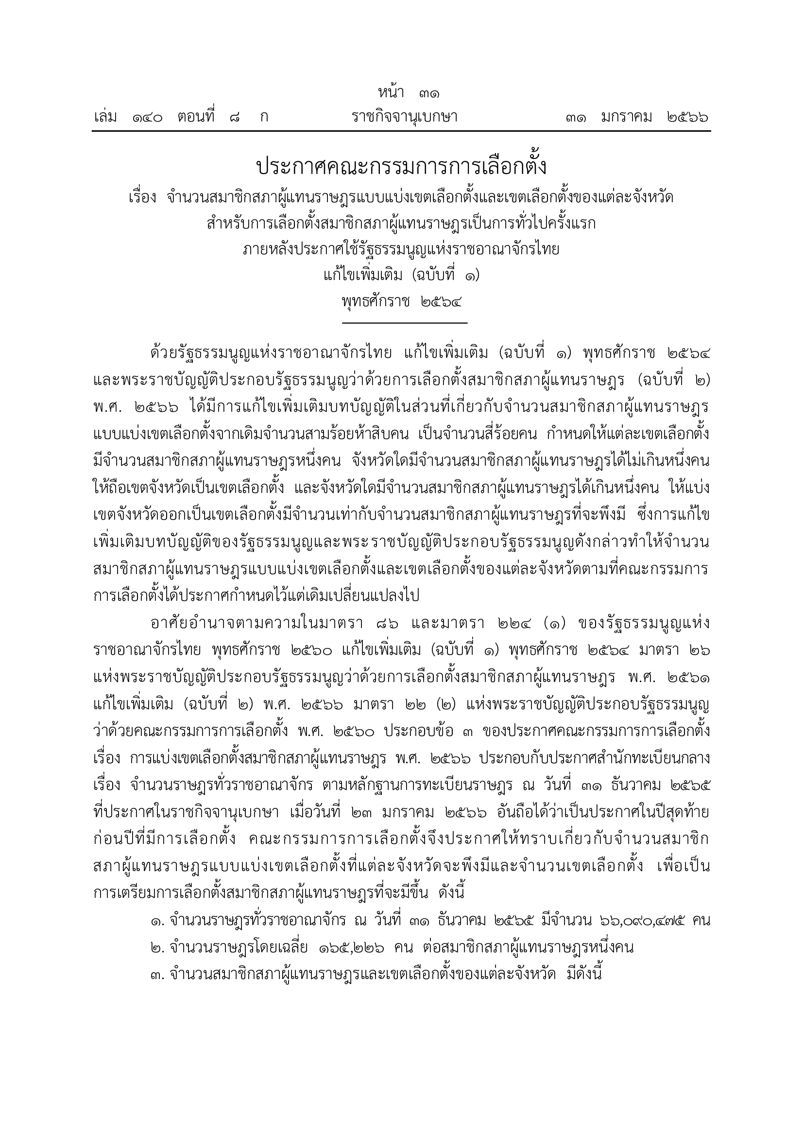 1 ก.พ. 66 เว็บไซต์ราชกิจจานุเบกษา เผยแพร่ประกาศคณะกรรมการการเลือกตั้ง เรื่อง จำนวนสมาชิกสภาผู้แทนราษฎรแบบแบ่งเขตเลือกตั้ง และเขตเลือกตั้งของแต่ละจังหวัด สำหรับการเลือกตั้งสมาชิกสภาผู้แทนราษฎร เป็นการทั่วไปครั้งแรก ภายหลังประกาศใช้รัฐธรรมนูญแห่งราชอาณาจักรไทย แก้ไขเพิ่มเติม (ฉบับที่ 1)