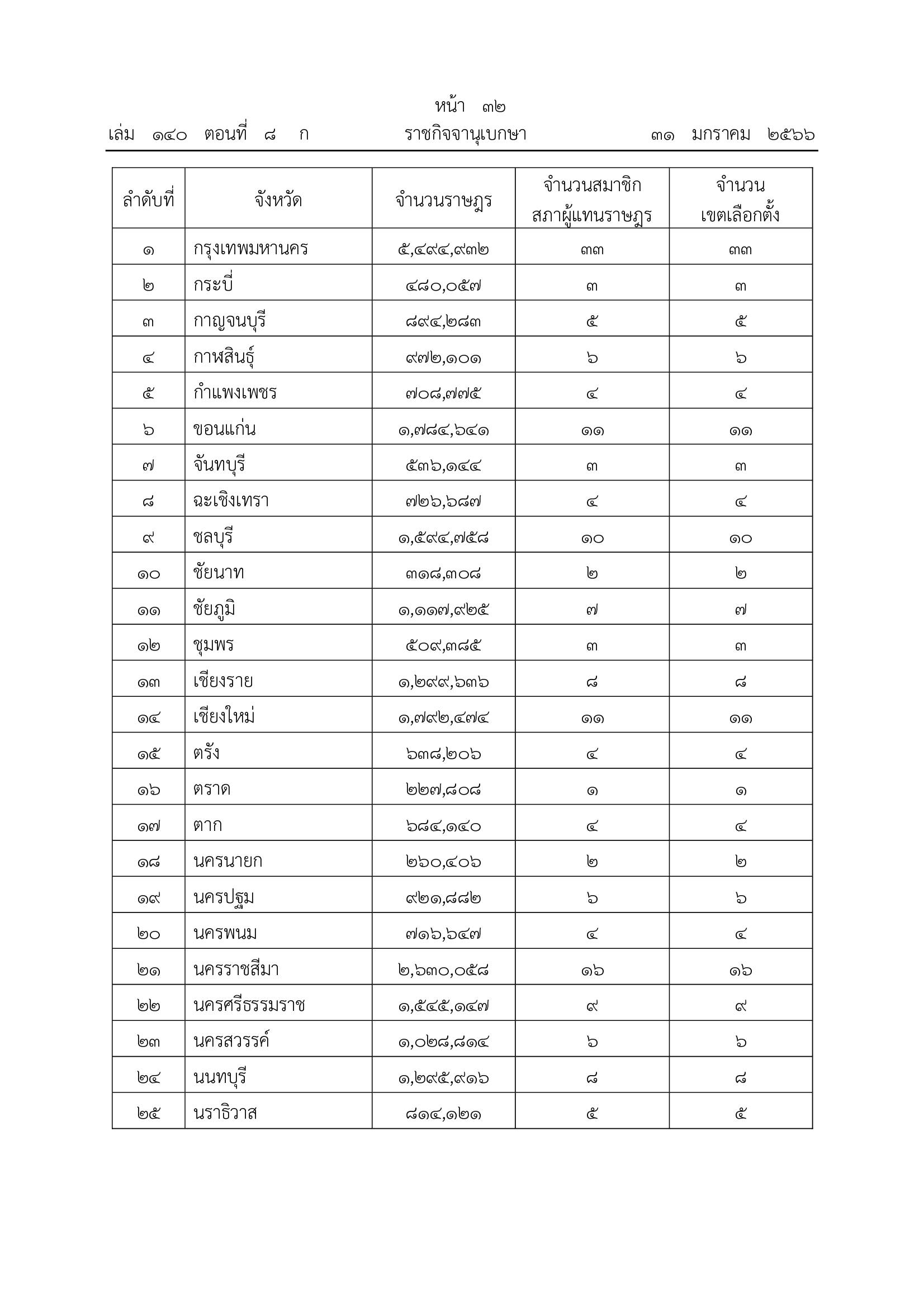 เรื่อง การแบ่งเขตเลือกตั้งสมาชิกสภาผู้แทนราษฎร พ.ศ. 2566 ประกอบกับประกาศสำนักทะเบียนกลาง เรื่องจำนวนราษฎรทั่วราชอาณาจักร ตามหลักฐานการทะเบียนราษฎร ณ วันที่ 31 ธันวาคม 2565 ที่ประกาศในราชกิจจานุเบกษา เมื่อวันที่ 23 มกราคม 2566 อันถือได้ว่าเป็นประกาศในปีสุดท้าย ก่อนปีที่มีการเลือกตั้ง คณะกรรมการการเลือกตั้งจึงประกาศให้ทราบเกี่ยวกับจำนวนสมาชิก สภาผู้แทนราษฎรแบบแบ่งเขตเลือกตั้งที่แต่ละจังหวัดจะพึงมีและจำนวนเขตเลือกตั้ง เพื่อเป็น การเตรียมการเลือกตั้งสมาชิกสภาผู้แทนราษฎรที่จะมีขึ้น ดังนี้