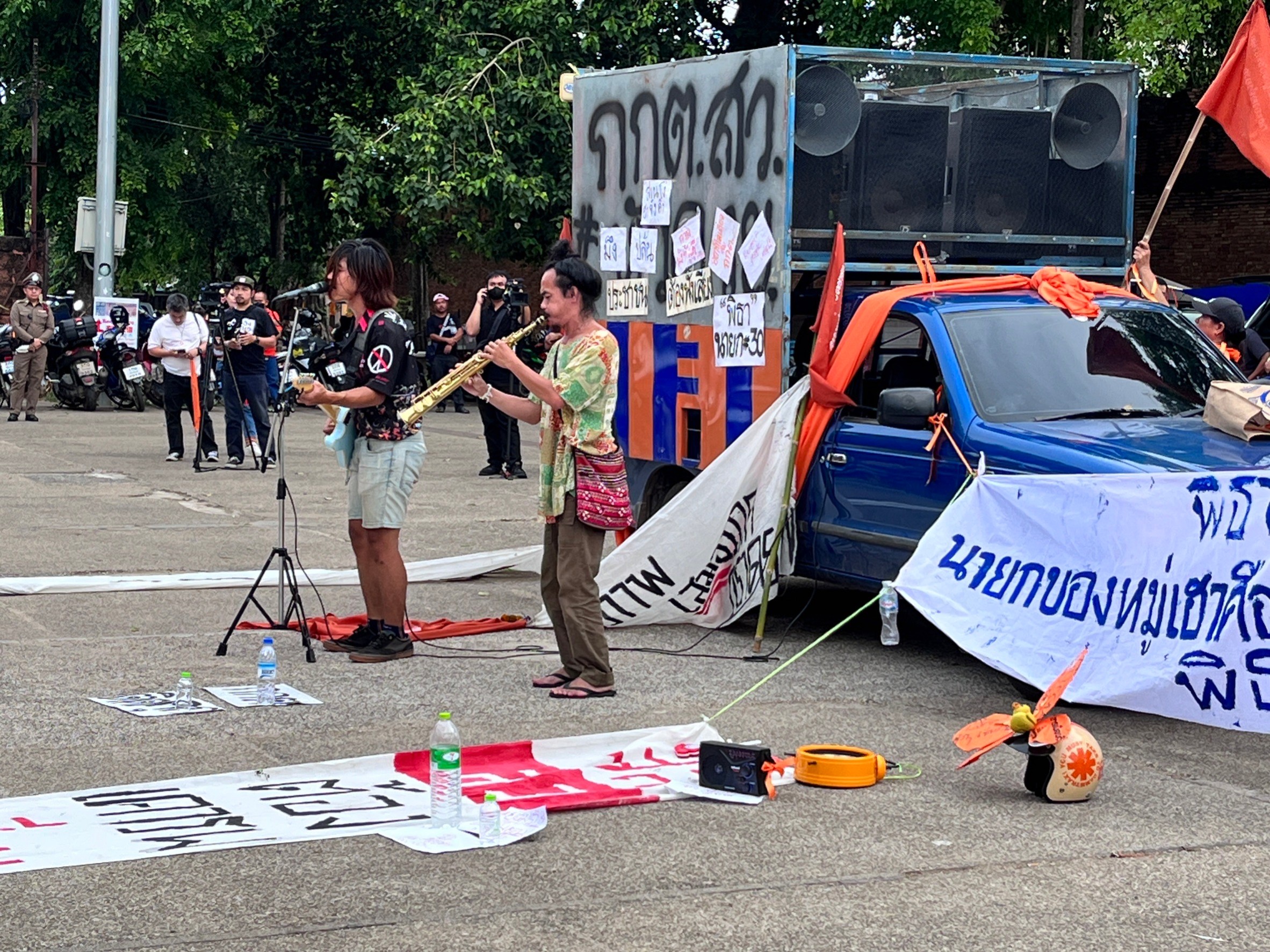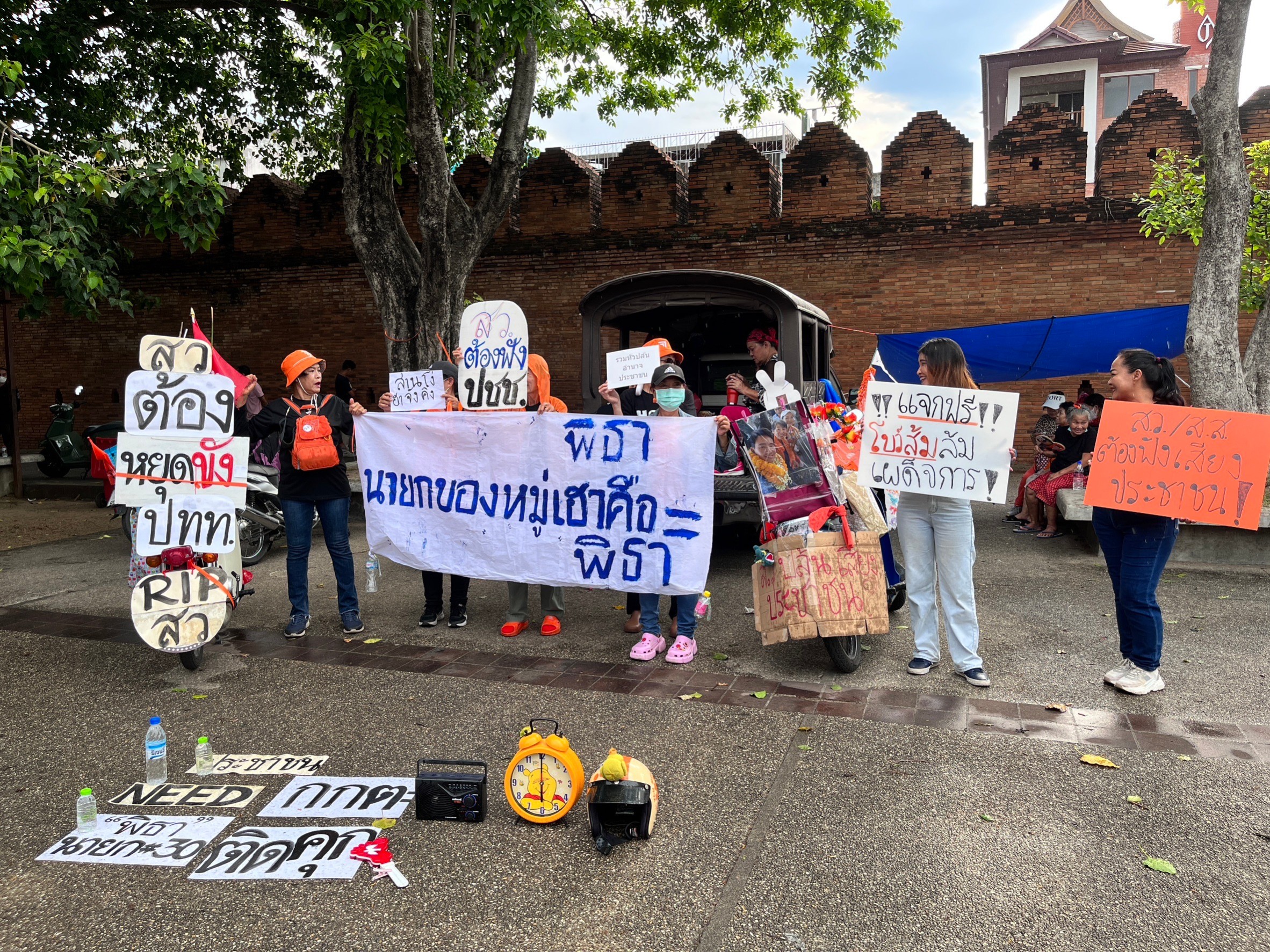โดยบรรดาด้อมส้ม ได้แสดงจุดยืน กางป้าย “นายกของพวกเราคือพิธา” รวมทั้งป้ายอื่นๆที่ว่ากล่าว ทาง กกต.และ ส.ว.ต่างๆนาๆ ต่อมามีรถติดเครื่องขยายเสียงเดินทางเข้ามาร่วมชุมนุมโดยฉีดสีสเปรย์ข้างรถในลักษณะคำพูดที่ไม่สุภาพ (เซ็นเซอร์) ขณะเดียวกันมี ผศ.ทัศนัย เศรษฐเสรี อาจารย์คณะวิจิตรศิลป์ มช. ได้เดินทางมาให้กำลังใจกลุ่มผู้ชุมนุมด้วย ขณะที่มีตำรวจ สภ.เมือง เชียงใหม่ ทั้งในและนอกเครื่องแบบ มาคอยสังเกตการณ์การชุมนุม