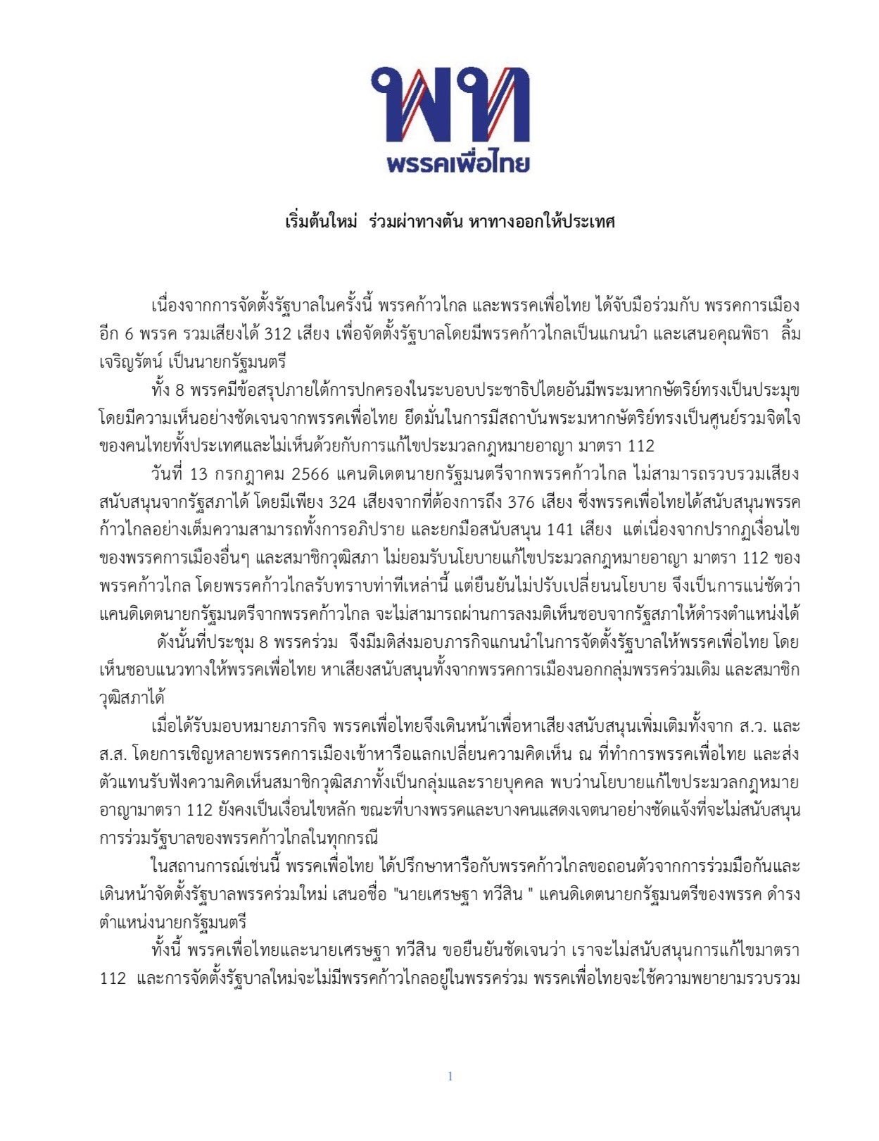 ทั้งนี้ พรรคเพื่อไทยและนายเศรษฐา ทวีสิน ขอยืนยันชัดเจนว่า เราจะไม่สนับสนุนการแก้ไขมาตรา 112 และการจัดตั้งรัฐบาลใหม่จะไม่มีพรรคก้าวไกลอยู่ในพรรคร่วม พรรคเพื่อไทยจะใช้ความพยายามรวบรวมเสียง ให้เพียงพอต่อการจัดตั้งรัฐบาลอย่างเหมาะสม และพรรคก้าวไกลจะทำหน้าที่เป็นฝ่ายค้านและยืนยันจะทำงานการเมืองในมิติใหม่ ที่จะเป็นประโยชน์ต่อประเทศชาติและพี่น้องประชาชน ในภารกิจที่สำคัญ ดังนี้