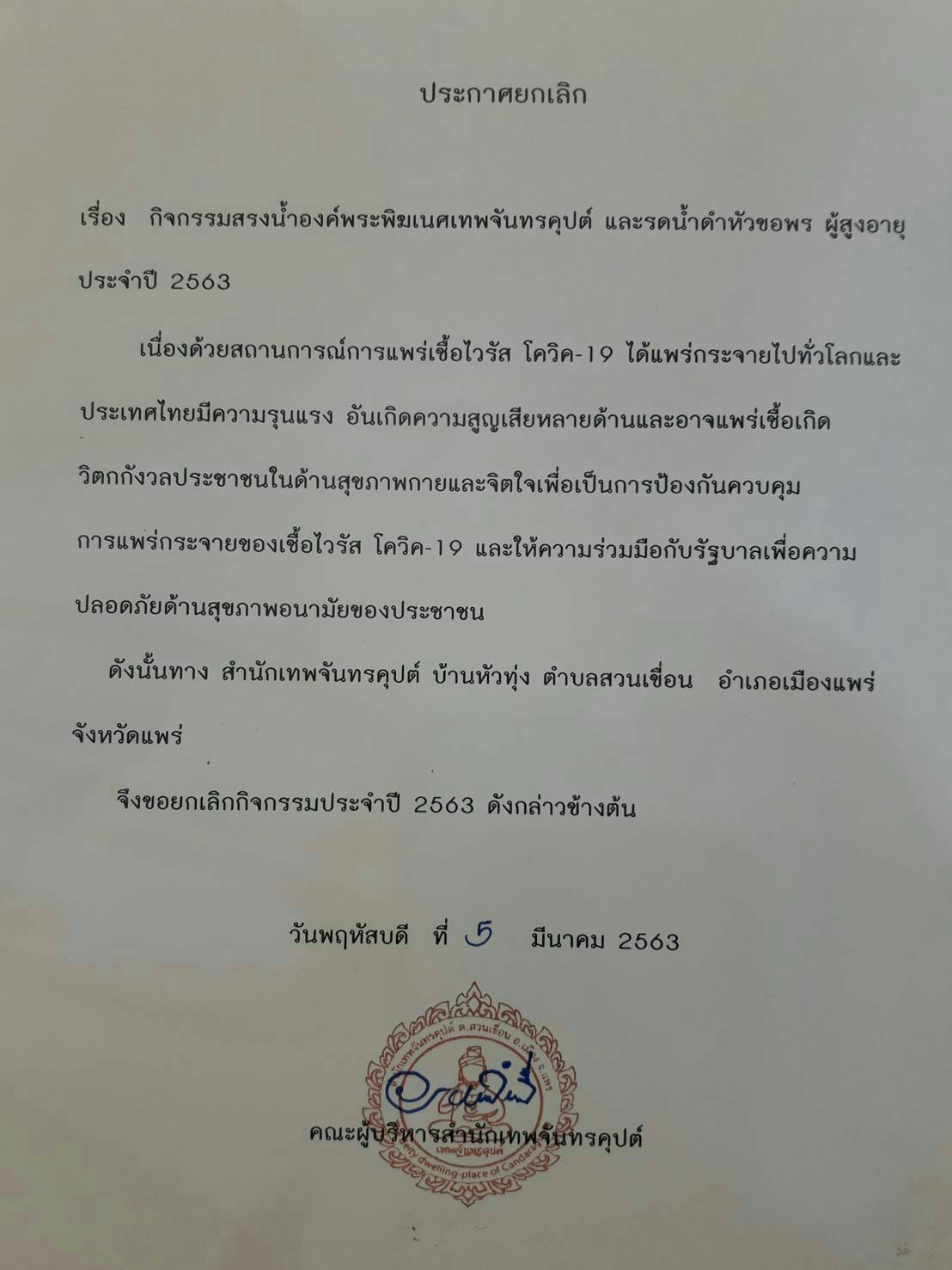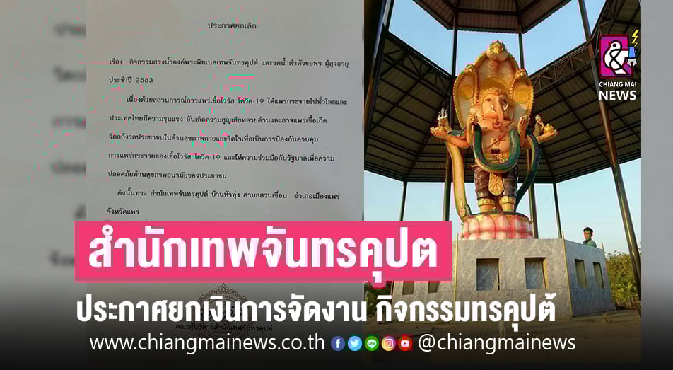 สำนักเทพจันทรคุปต์ บ้านหัวทุ่ง ต.สวนเขื่อน อ.เมือง จ.แพร่ ประกาศยกเงินการจัดงาน กิจกรรมสรงน้ำองค์พระพิฆเนศเทพจันทรคุปต์ และรดน้ำดำหัวขอพรผู้สูงอายุ ประจำปี 2563 เนื่องด้วยสถานการณ์การแพร่ระบาดเชื้อไวรัสโควิด-19 ได้แพร่กระจายไปทั่วโลก และประเทศไทยมีความรุนแรง อันเกิดความสูญเสียหลายด้าน และอาจแพร่เชื้อเกิดความวิตกกังวลของประชาชน ในด้านสุขภาพกายและจิตใจ เพื่อเป็นการป้องกันควบคุมการแพร่กระจายของเชื้อไวรัส โควิด-19 และให้ความร่วมมือกับรัฐบาล เพื่อความปลอดภัยด้านสุขภาพอนามัยของประชาชน ดังนั้น สำนักเทพจันทรคุปต์ บ้านหัวทุ่ง ต.สวนเขื่อน จึงขอยกเลิกกิจกรรมประจำปี 2563 ดังกล่าวข้างต้น
