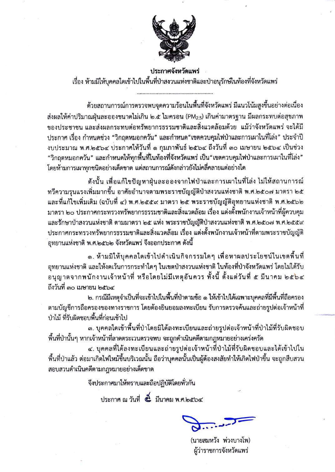 ผู้สื่อข่าวรายงานว่า จังหวัดแพร่โดยนายสมหวัง พ่วงบางโพ ผู้ว่าราชการจังหวัดแพร่ ได้ออกประกาศจังหวัดแพร่เรื่อง ห้ามมิให้บุคคลใดเข้าไปในพื้นที่ป่าสงวนแห่งชาติและป่าอนุรักษ์ในท้องที่จังหวัดแพร่ด้วยสถานการณ์การตรวจพบจุดความร้อนในพื้นที่จังหวัดแพร่ มีแนวโน้มสูงขึ้นอย่างต่อเนื่องส่งผลให้ค่าปริมาณฝุ่นละอองขนาดไม่เกิน 2.5 ไมครอน (PM25) เกินค่ามาตรฐาน มีผลกระทบต่อสุขภาพของประชาชน และส่งผลกระทบต่อทรัพยากรธรรมชาติและสิ่งแวดล้อมด้วย