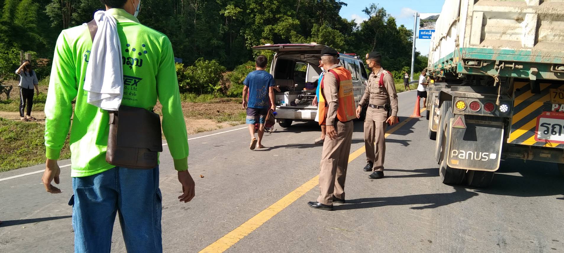 จากการสอบถสวนคนขับรถพ่วงให้การว่าได้ขับรถขาลงมาพอมาถึงที่เกิดเหตุก็ได้เห็นผู้บาดเจ็บกำลังขับขี่รถมอเตอร์ไซค์เลาะเลียบทางฝั่งถนนขาล่องตนเองจึงได้ขับแซงขึ้นมาและก็ได้ยินเสียงดังโครมตนเองจึงได้เบรคหยุดอยู่ตรงนั้นและลงรถไปดูพบทั้งคนทั้งรถถูกชนกระเด็นอยู่ตรงนั้นเอง