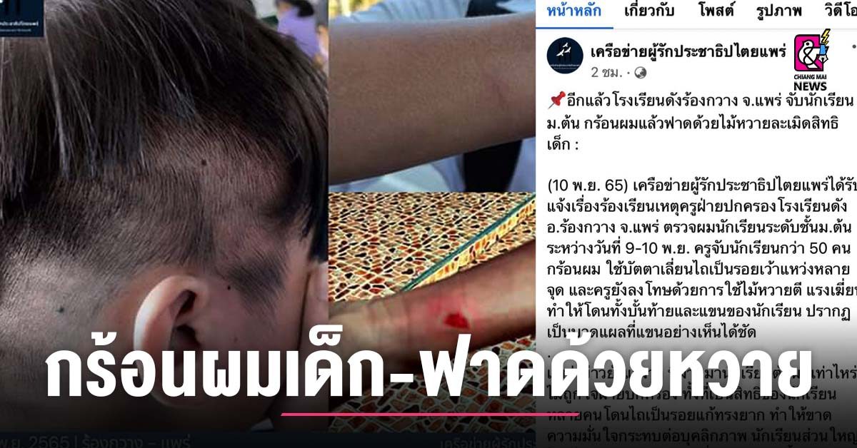 ผู้สื่อข่าวรายงานว่า กระแสโซเซียล จ.แพร่ ร้อนระอุ แชร์กันไปทั่ว เมื่อเพจ เครือข่ายผู้รักประชาธิปไตยแพร่ โพสภาพ พร้อมกับ เด็กนักเรียนถูกกร้อนผม และรอยถูกฟาด และขึ้นหัวว่า “อีกแล้วโรงเรียนดัง จ.แพร่ จับนักเรียน ม.ต้น กร้อนผมแล้วฟาดด้วยไม้หวายละเมิดสิทธิเด็ก”