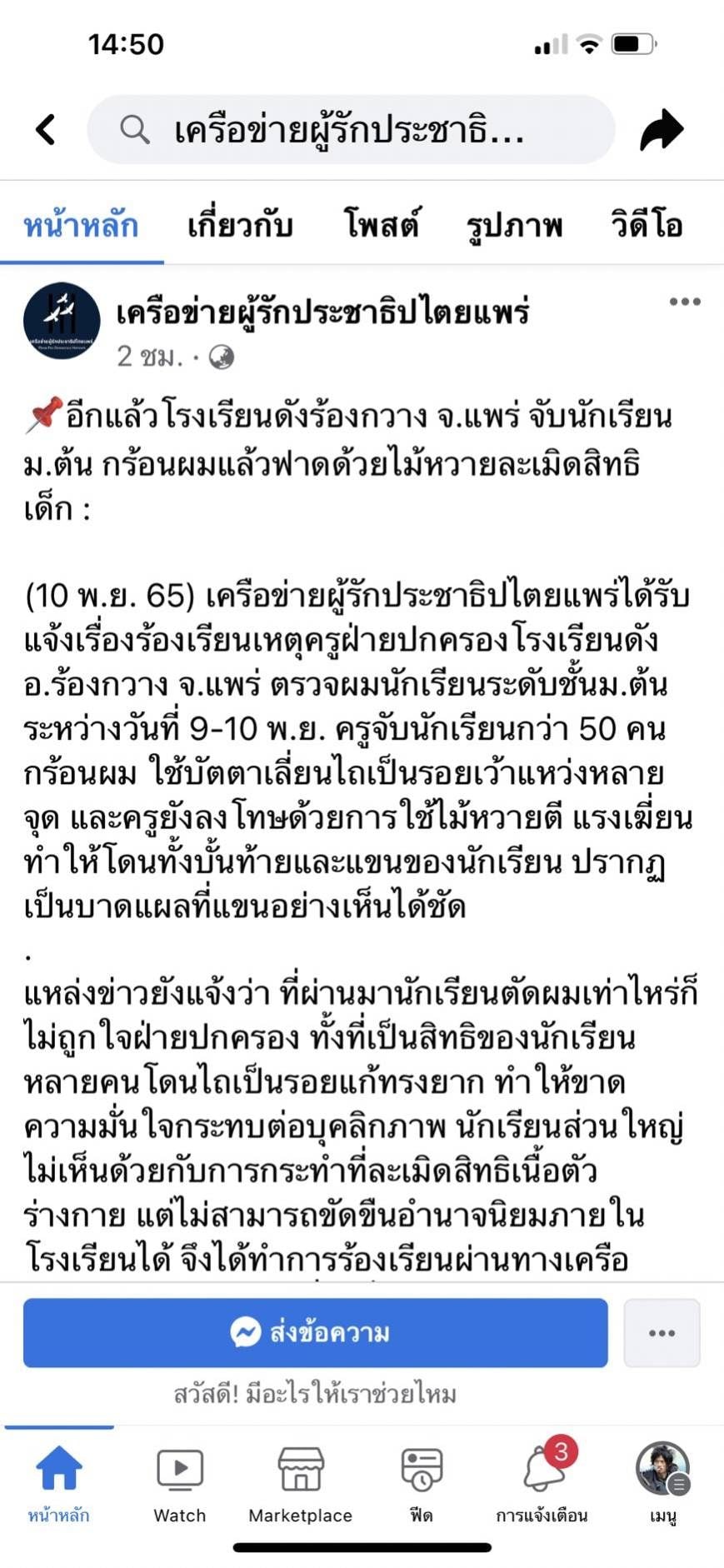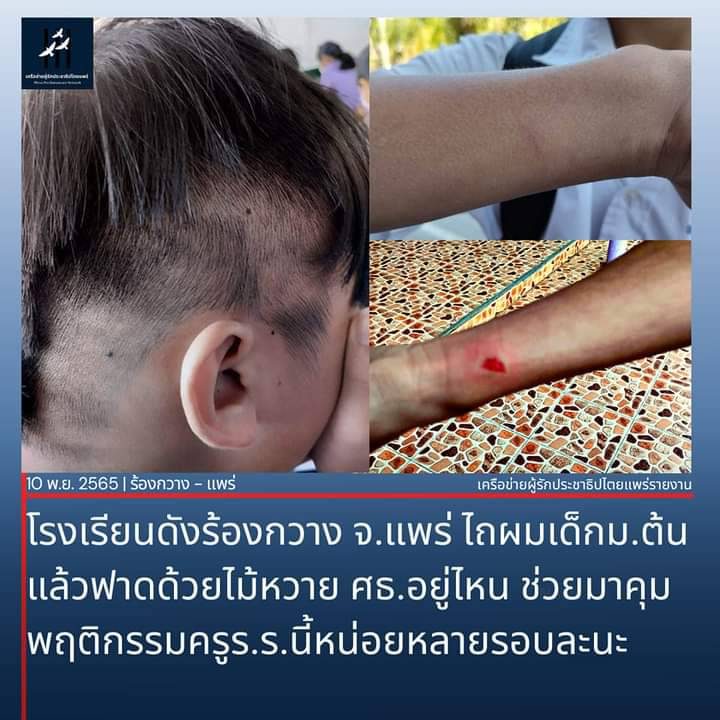 (10 พ.ย. 65) เครือข่ายผู้รักประชาธิปไตยแพร่ได้รับแจ้งเรื่องร้องเรียนเหตุครูฝ่ายปกครองโรงเรียนดัง อ.ร้องกวาง จ.แพร่ ตรวจผมนักเรียนระดับชั้นม.ต้น ระหว่างวันที่ 9-10 พ.ย. ครูจับนักเรียนกว่า 50 คน กร้อนผม ใช้ปัตตาเลี่ยนไถเป็นรอยเว้าแหว่งหลายจุด และครูยังลงโทษด้วยการใช้ไม้หวายตี แรงเฆี่ยนทำให้โดนทั้งบั้นท้ายและแขนของนักเรียน ปรากฏเป็นบาดแผลที่แขนอย่างเห็นได้ชัด