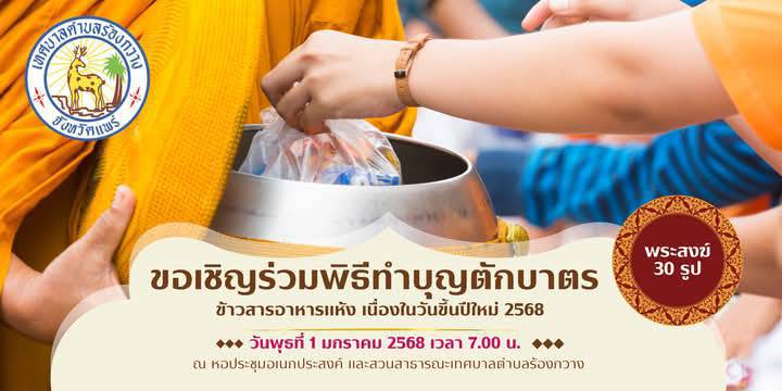 นายพิพัฒน์ ซื่อทรงธรรม นายกเทศมนตรีตำบลร้องกวาง อ.ร้องกวาง จ.แพร่ เผยว่า เทศบาลตำบลร้องกวาง ขอเชิญร่วมโครงการประเพณีทำบุญตักบาตรข้าวสารอาหารแห้ง เนื่องในวันขึ้นปีใหม่ ประจำปี พ.ศ. 2568 ในวันพุธที่ 1 มกราคม 2568 เวลา 07.00 น. ณ หอประชุมอเนกประสงค์ และบริเวณสวนสาธารณะเทศบาลตำบลร้องกวาง