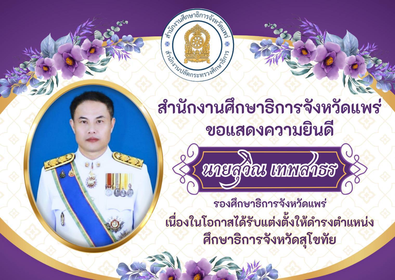 สำนักงานศึกษาธิการจังหวัดแพร่ ขอแสดงความยินดี นายสุวิณ เทพสาธร รองศึกษาธิการจังหวัดแพร่ เนื่องในโอกาสได้รับแต่งตั้งให้ดำรงตำแหน่ง ศึกษาธิการจังหวัดสุโขทัย