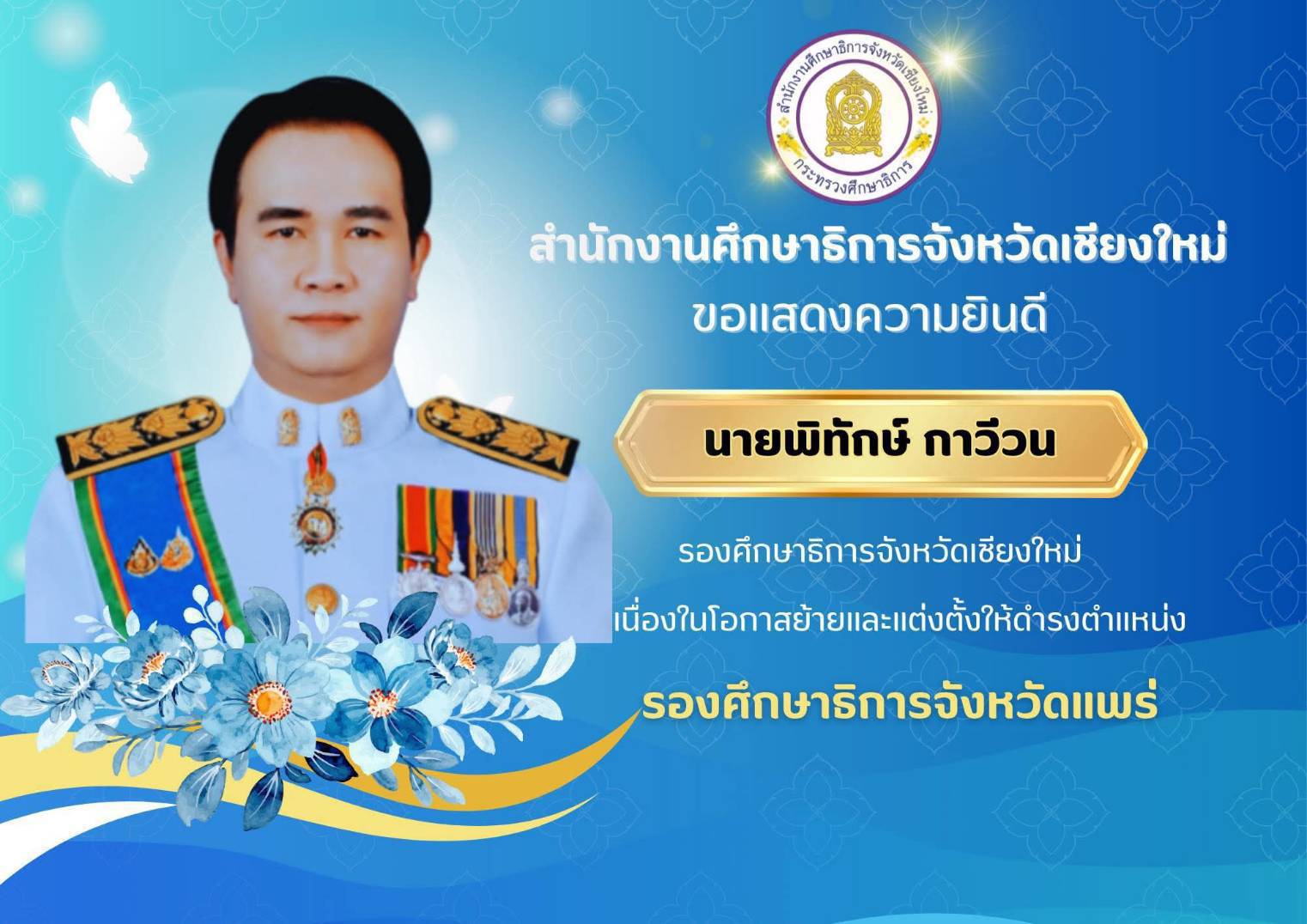 สำนักงานศึกษาธิการจังหวัดเชียงใหม่ ขอแสดงความยินดี นายพิทักษ์ กาวีวน รองศึกษาธิการจังหวัดเซียงใหม่ เนื่องในโอกาสย้ายและแต่งตั้งให้ดำรงตำแหน่ง รองศึกษาธิการจังหวัดแพร่
