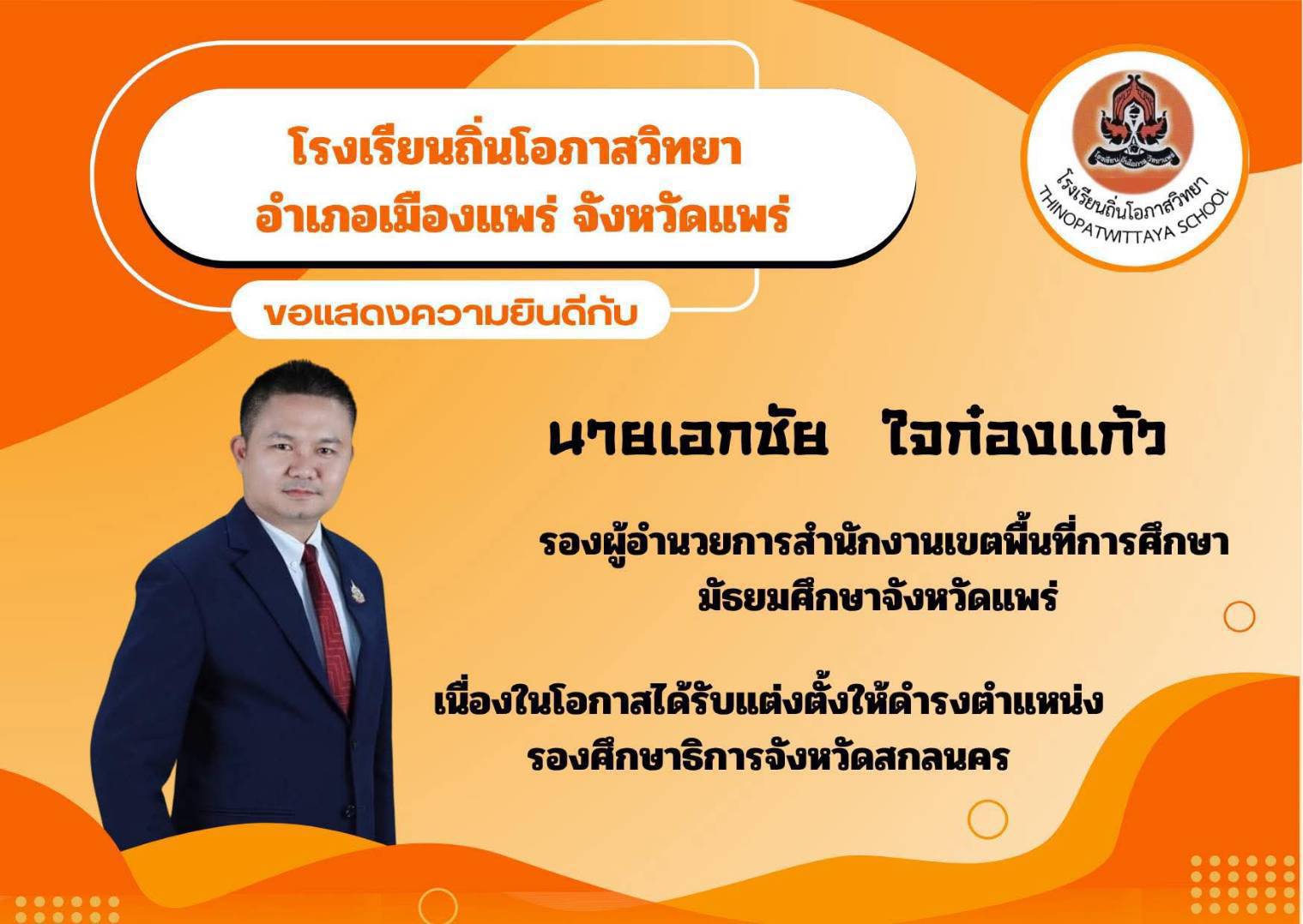 ทางด้านโรงเรียนถิ่นโอภาสวิทยา อำเภอเมืองแพร่ จังหวัดแพร่ ขอแสดงความยินดีกับ นายเอกชัย ใจก๋องแก้ว รองผู้อำนวยการสำนักงานเขตพื้นที่การศึกษา มัธยมศึกษาจังหวัดแพร่ เนื่องในโอกาสได้รับแต่งตั้งให้ดำรงตำแหน่ง รองศึกษาธิการจังหวัดสกลนคร
