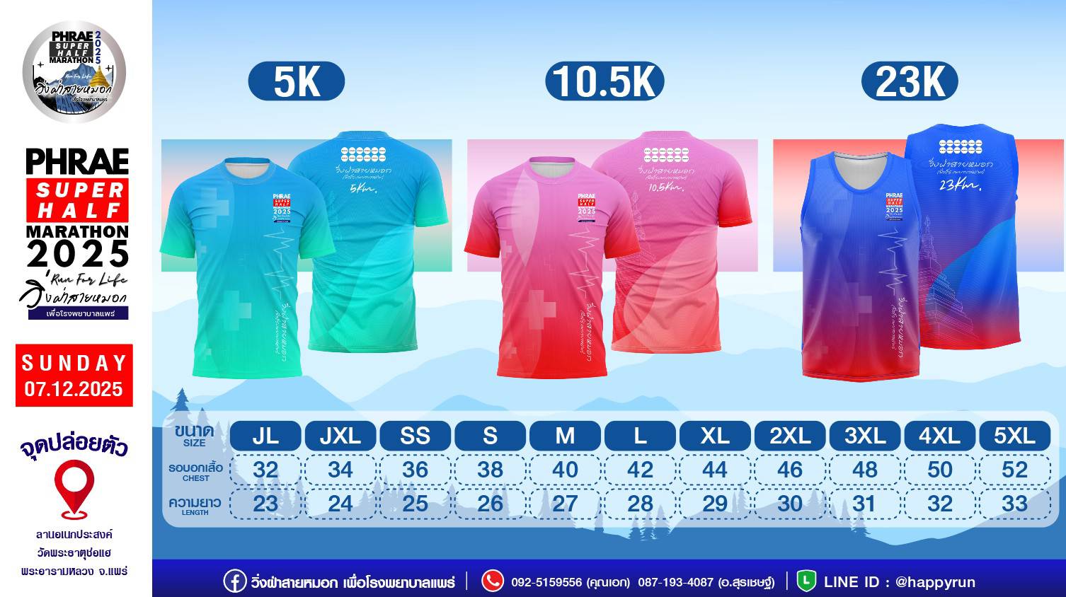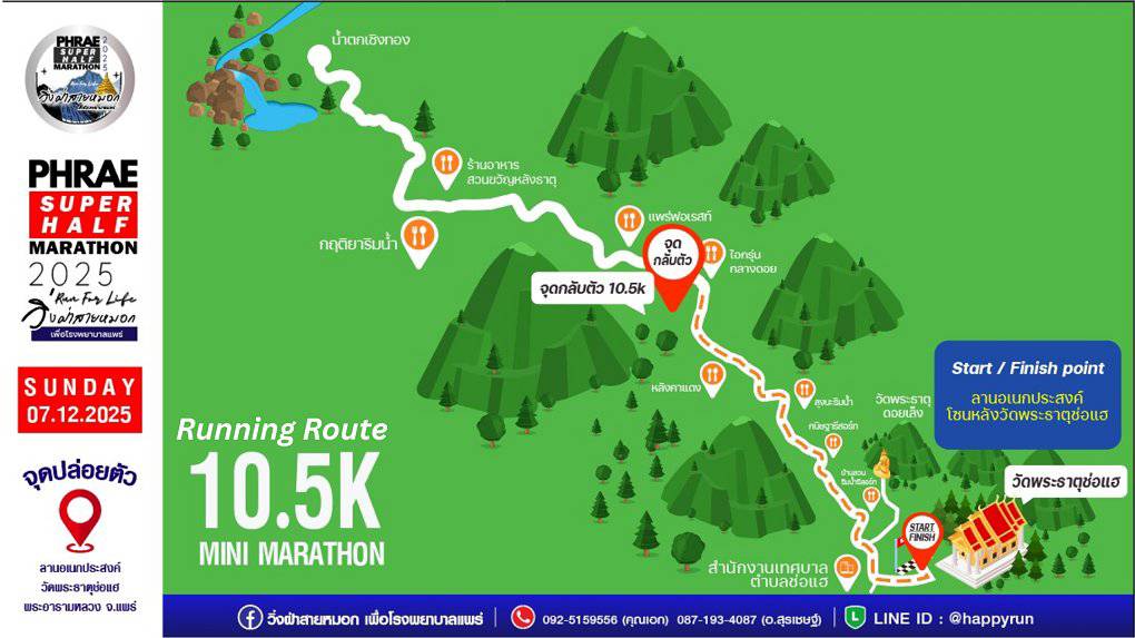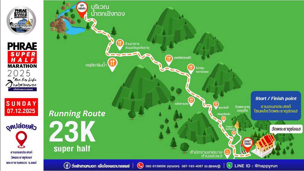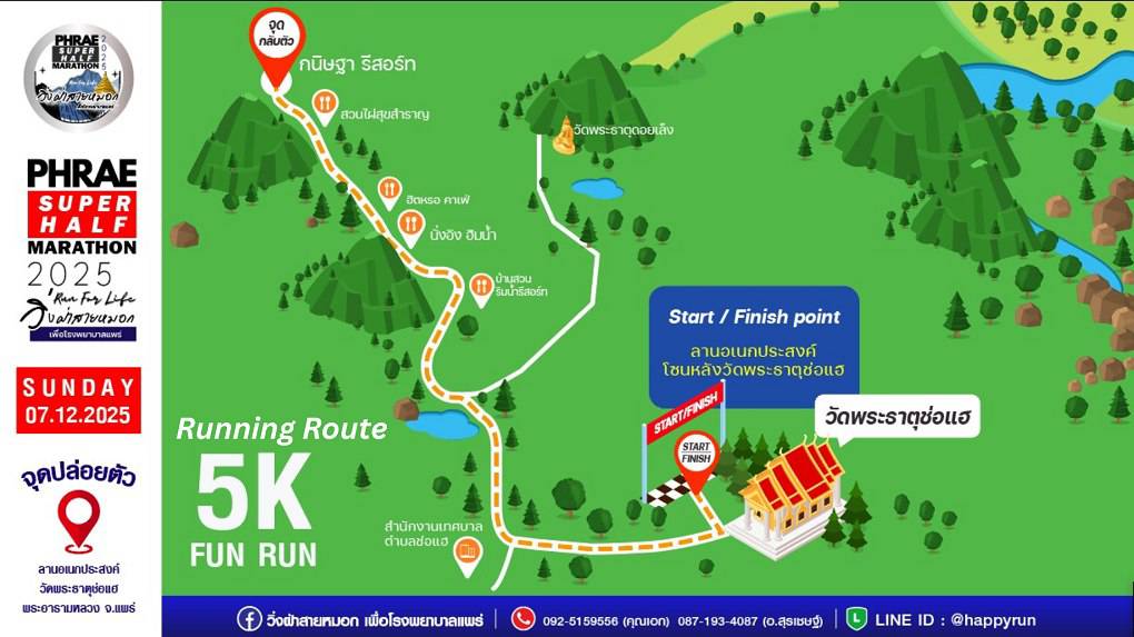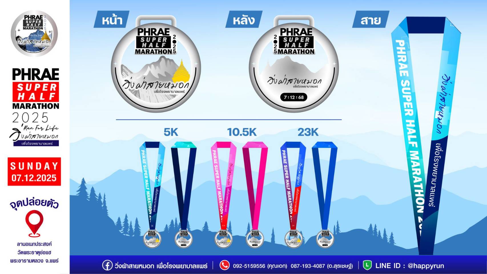 สำหรับกิจกรรม “วิ่งฝ่าสายหมอก PHRAE SUPER HALF MARATHON 2025” กำหนดจัดขึ้นในวันอาทิตย์ที่ 7 ธันวาคม 2568 แบ่งการแข่งขันออกเป็น 5 ประเภท ได้แก่ Fun Run (อายุไม่เกิน 18 ปี ) ระยะทาง 5 กิโลเมตร Fun Run ระยะทาง 5 กิโลเมตร Mini Marathon ระยะทาง 10.5 กิโลเมตร Super Half Marathon ระยะทาง 23 กิโลเมตร และ VIP โดยจุดปล่อยตัวนักวิ่งอยู่ที่ลานกิจกรรมวัดพระธาตุช่อแฮ พระอารามหลวง เส้นทางผ่านถนนด้านหลังพระธาตุช่อแฮ ท่ามกลางบรรยากาศธรรมชาติอันงดงามของจังหวัดแพร่ในฤดูหนาว เปิดรับสมัคร Early Bird ระหว่างวันที่ 25 กันยายน – 8 ตุลาคม 2568 สมัครราคาปกติตั้งแต่วันที่ 9 ตุลาคม 2568 และปิดรับสมัคร วันที่ 11 พฤศจิกายน 2568 นี้ สมัครได้ที่ www.phraerun.com หรือติดต่อ 092-5159556 และ087-1934087