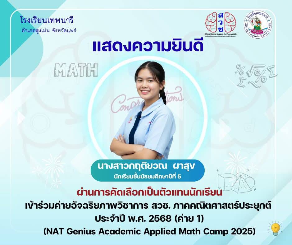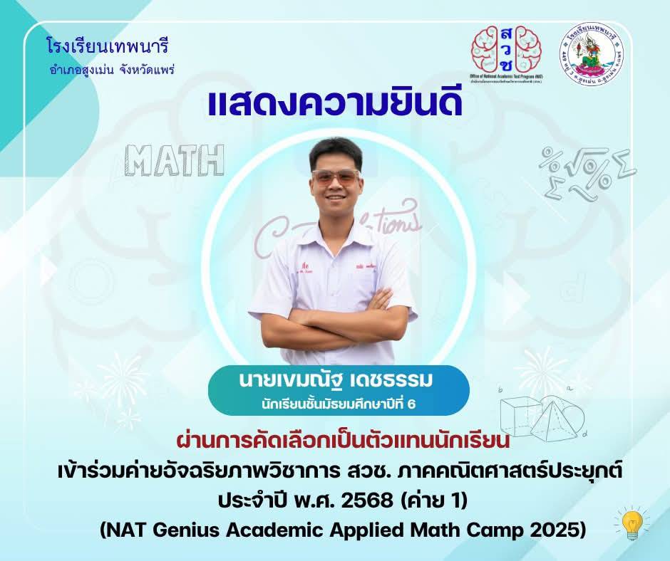นายสิทธิเดช พันธุ์นิติพงศ์ ผู้อำนวยการโรงเรียนเทพนารี อ.สูงเม่น จ.แพร่ และคณะครูโรงเรียนเทพนารีแสดงความยินดีนักเรียนผ่านการคัดเลือกเข้าค่ายอัจฉริยภาพวิชาการ สวช. ภาคคณิตศาสตร์ประยุกต์ ประจำปี พ.ศ. 2568 (ค่าย 1) NAT Genius Academic Applied Math Camp 2025 โดยสำนักงานโครงการสอบวัดทักษะวิชาการระดับชาติ จำนวน 2 คน คือ