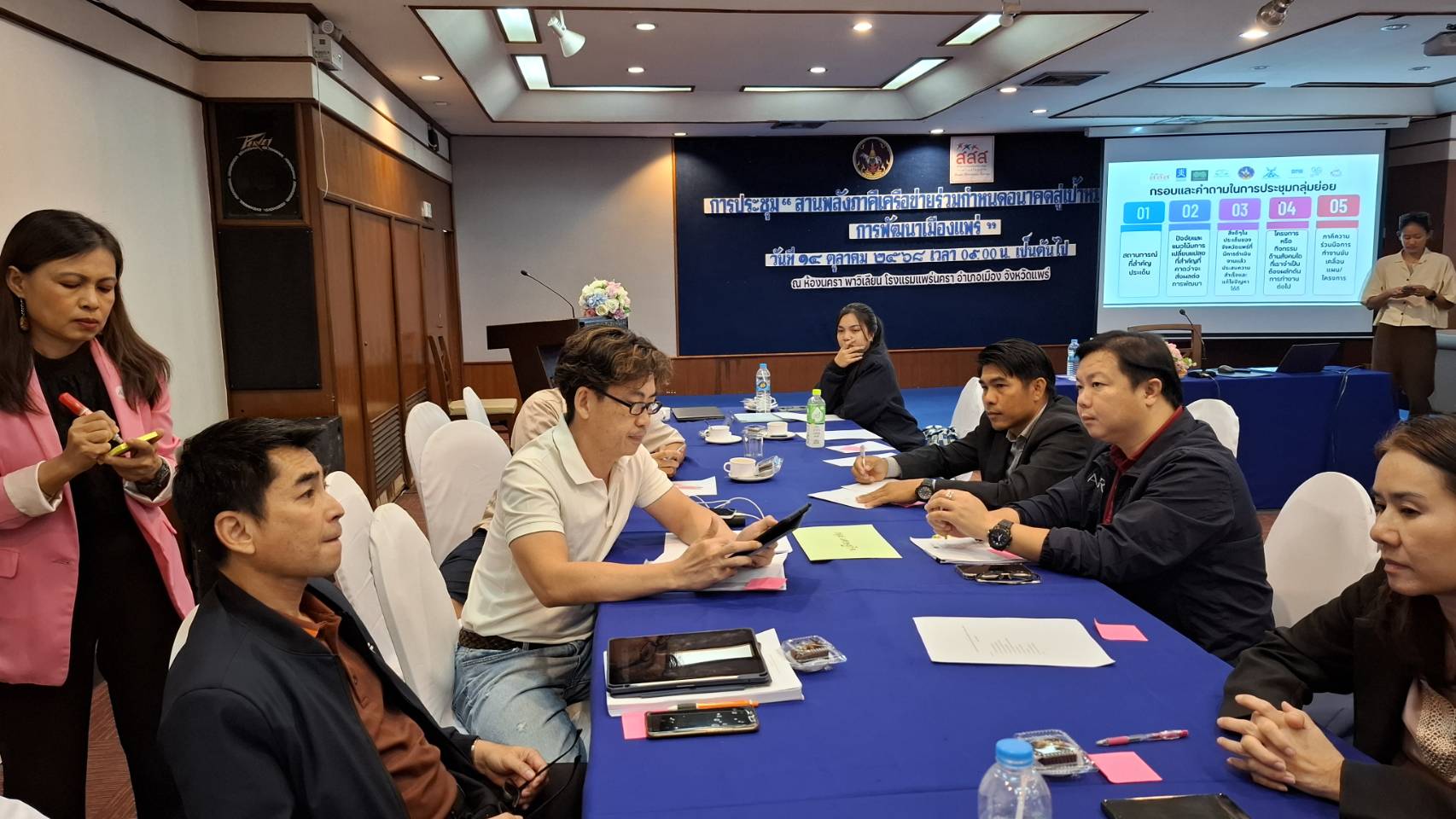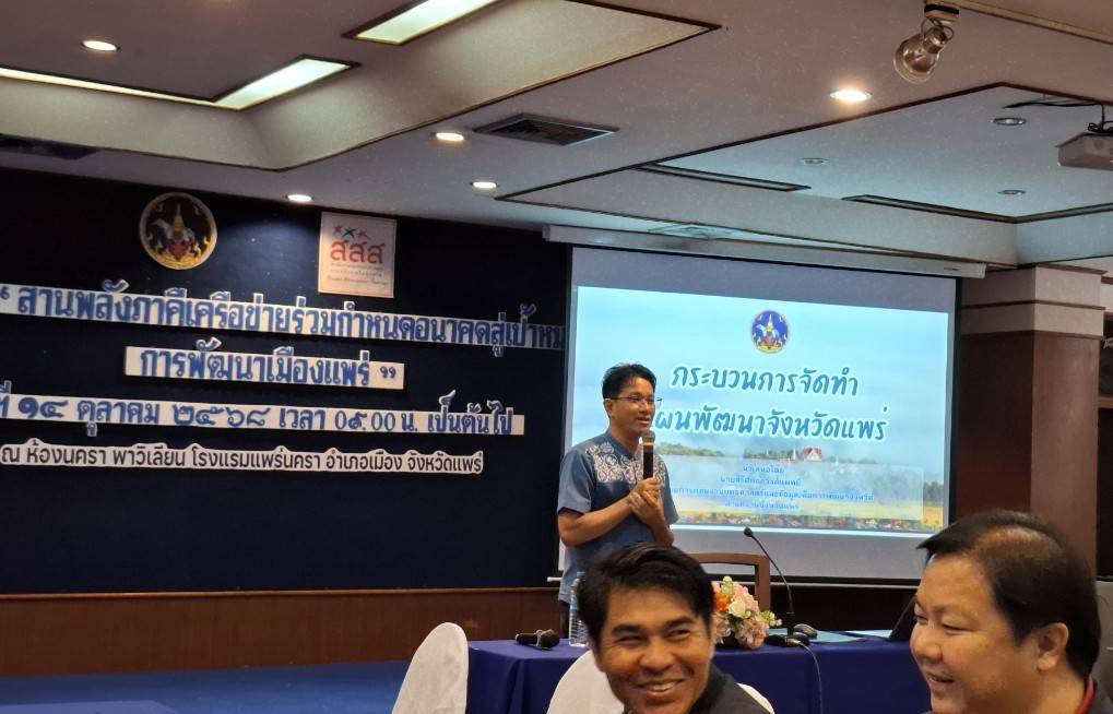วันอังคารที่ 14 ตุลาคม 2568 เวลา 08.30 น. สมาคมภาคีพัฒนาจังหวัดแพร่ จัดประชุมสานพลังภาคีเครือข่ายร่วมกำหนดอนาคตสู่เป้าหมายการพัฒนาเมืองแพร่ เพื่อยกระดับกลไกและกระบวนการจัดทำนโยบายสาธารณะ การพัฒนาความร่วมมือให้มีการดำเนินการเป็นระบบ และขยายเครือข่ายการทำงานกับภาคีหน่วยงานต่าง ๆ เพื่อสร้างการรับรู้ในระดับจังหวัดร่วมกัน และสนับสนุนการขับเคลื่อนประเด็นนโยบายสาธารณะและแผนพัฒนาที่เป็นประเด็นร่วมของจังหวัดแพร่ โดยมีผู้รับผิดชอบจัดทำแผนพัฒนาจังหวัดแพร่เข้าร่วมเสนอข้อมูล จัดทำและเสนอประเด็นแผนยุทธศาสตร์