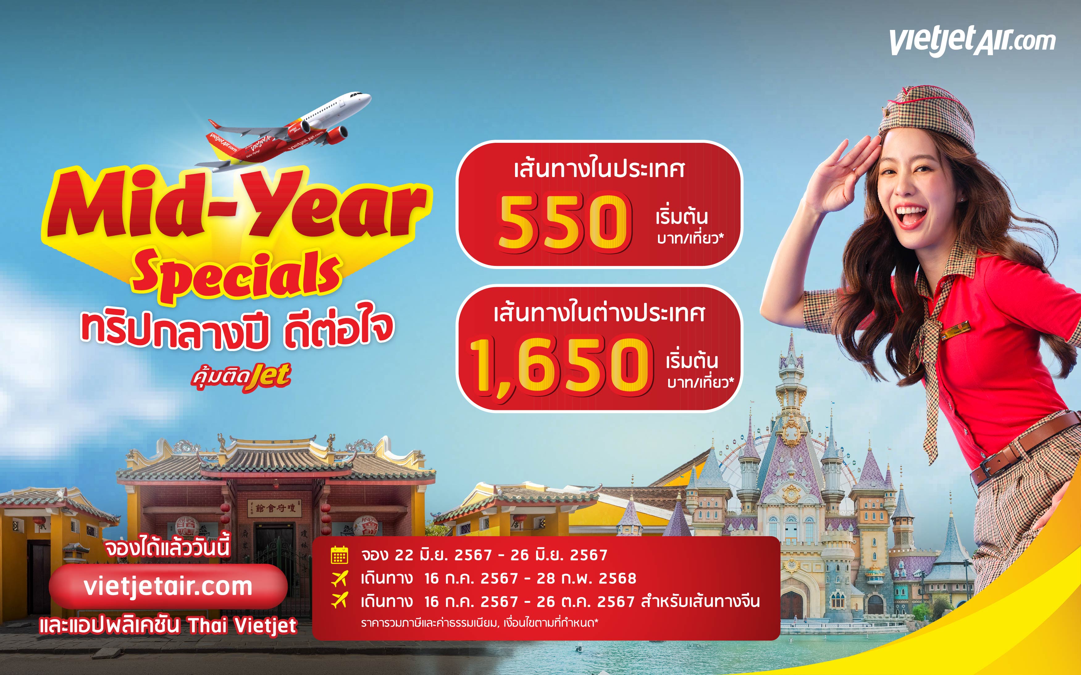 (กรุงเทพฯ, 24 มิถุนายน 2567) – เวียตเจ็ทไทยแลนด์เชิญชวนผู้โดยสารวางแผนเดินทางช่วงกลางปีด้วยโปรโมชั่น “ทริปกลางปี ดีต่อใจ (Mid-year Specials) เสนอบัตรโดยสารราคาพิเศษ เริ่มต้นเพียง 550 บาท (ราคารวมภาษีและค่าธรรมเนียม) สำหรับเดินทางบนเครือข่ายเส้นทางบินภายในประเทศ และราคาเริ่มต้น 1,650 บาท (ราคารวมภาษีและค่าธรรมเนียม) สำหรับเดินทางบนเครือข่ายเส้นทางบินระหว่างประเทศของเวียตเจ็ทไทยแลนด์ สามารถสำรองบัตรโดยสารได้ระหว่างวันที่ 22 – 26 มิถุนายน 2567 ใช้เดินทางได้ระหว่างวันที่ 16 กรกฎาคม 2567 – 28 กุมภาพันธ์ 2568 (ยกเว้นวันหยุดนักขัตฤกษ์) ที่ www.vietjetair.com