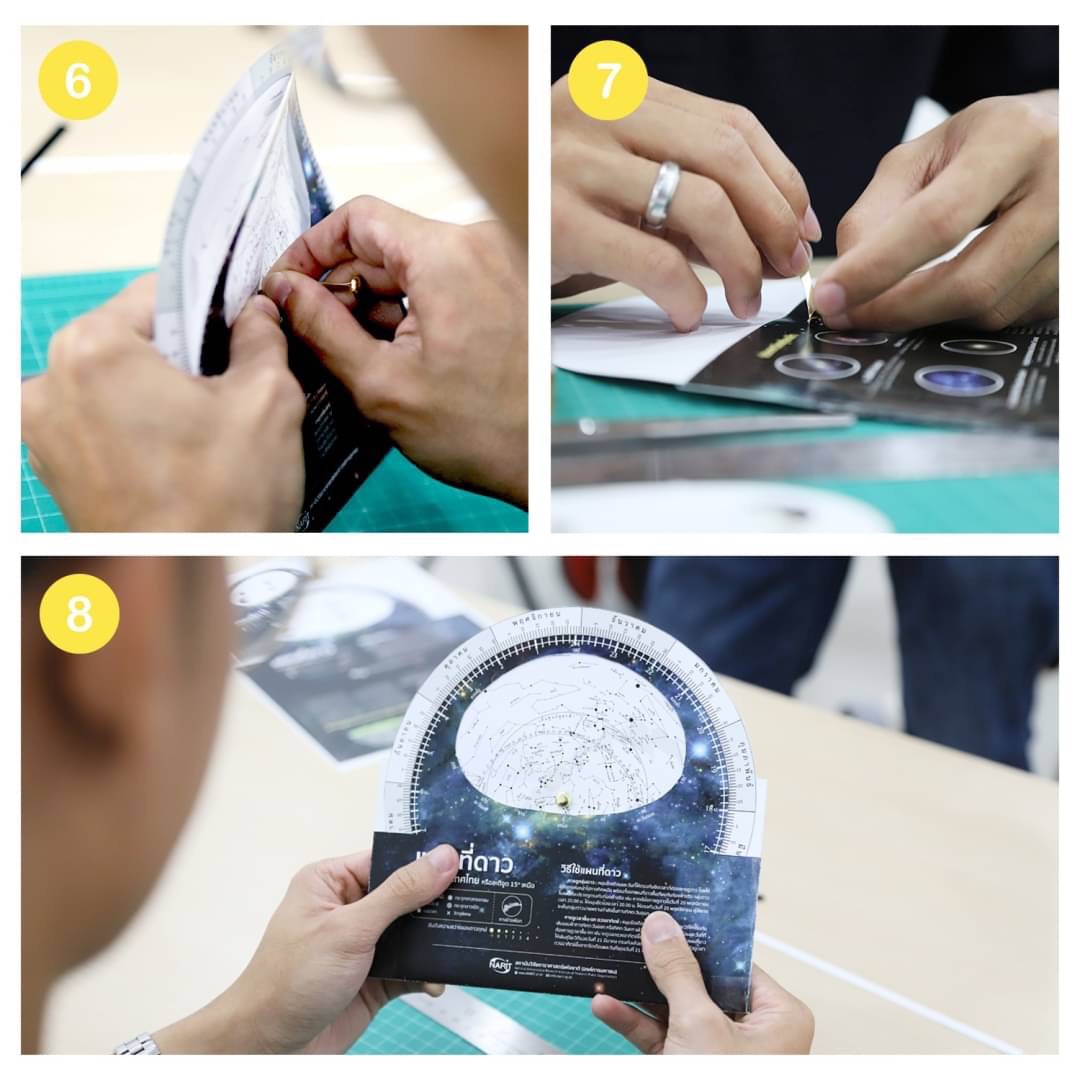 6) หลังจากประกอบแผนที่ดาวทั้งสองส่วนเข้าด้วยกันแล้ว ใช้หมุดเจาะรูตรงกลาง เพื่อเชื่อมแผนที่ดาวทั้งสองส่วนเข้าด้วยกัน สำหรับเป็นจุดหมุนแผนที่ดาว
