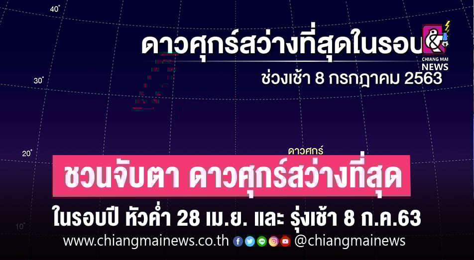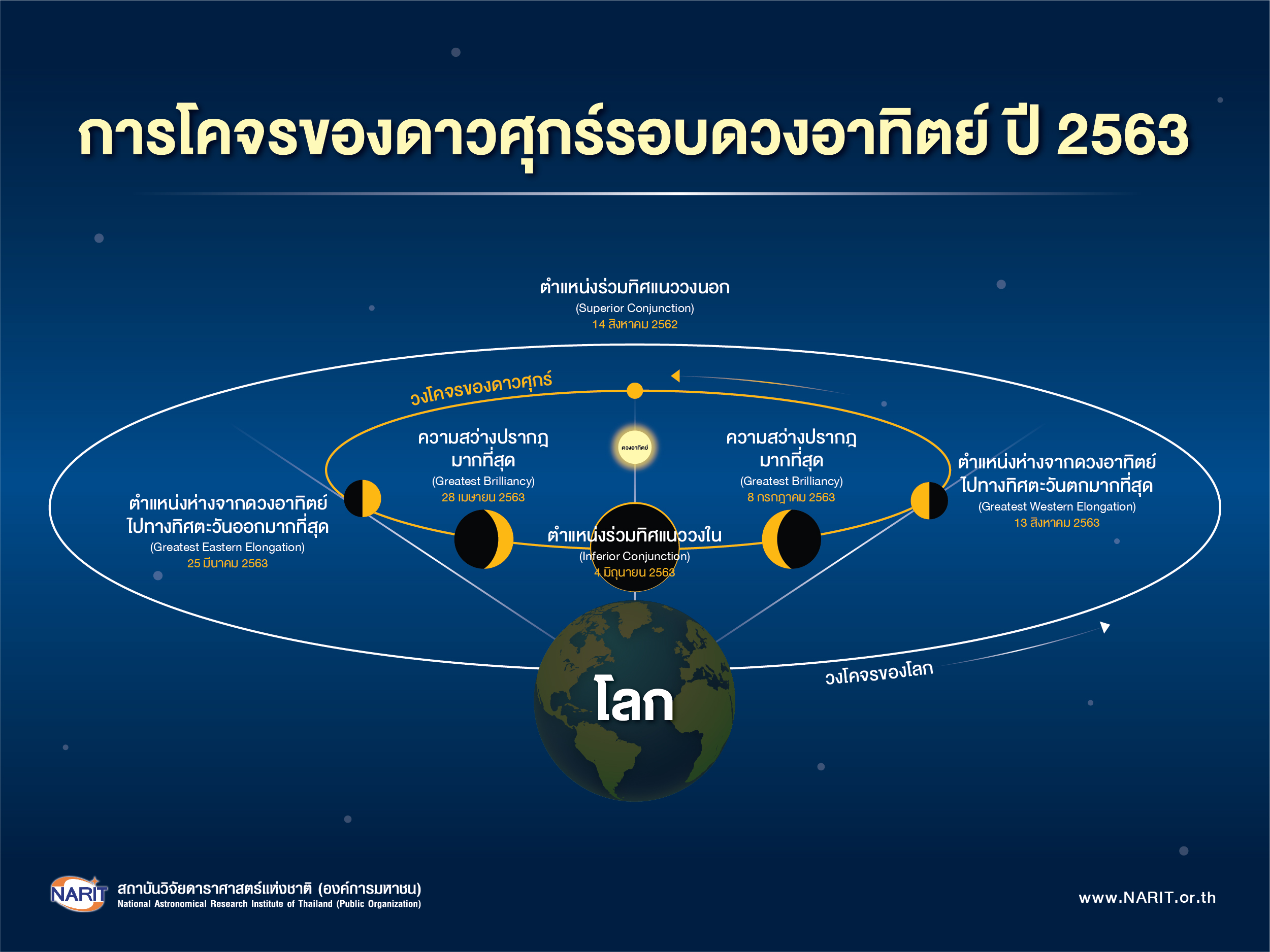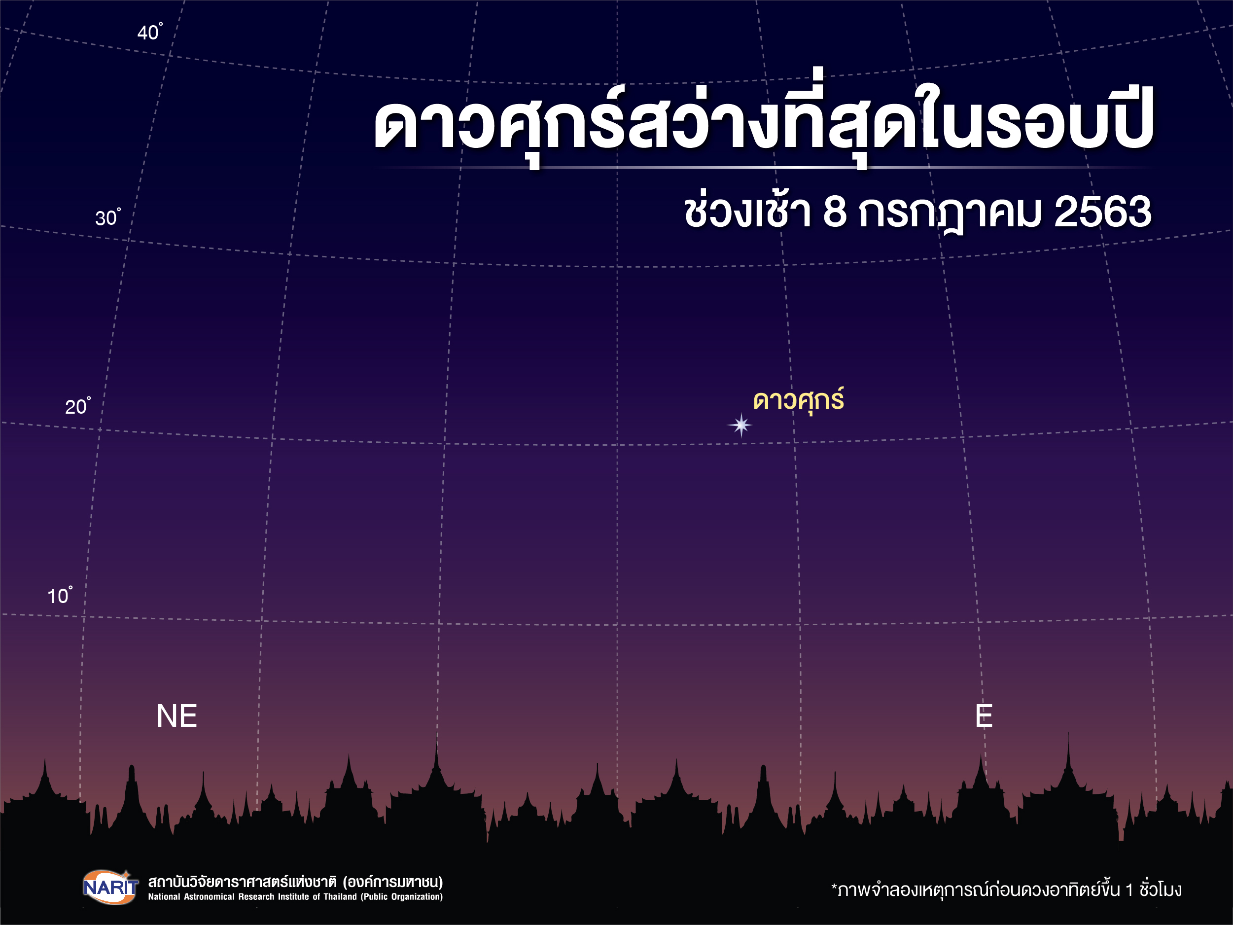 นายศุภฤกษ์ คฤหานนท์ หัวหน้างานบริการวิชาการทางดาราศาสตร์ สดร. เผยว่า ในช่วงค่ำวันที่ 28 เมษายน 2563 หลังดวงอาทิตย์ตก เวลาประมาณ 18:30-21:00 น. และ รุ่งเช้าวันที่ 8 กรกฎาคม 2563 ก่อนดวงอาทิตย์ขึ้น เวลาประมาณ 03:30-06:00 น. ดาวศุกร์จะปรากฏสว่างที่สุดในรอบปี วันดังกล่าวจะสังเกตเห็นดาวศุกร์สว่างสุกใส ดูได้ด้วยตาเปล่าอย่างชัดเจนทั่วประเทศ คาดว่าจะมีค่าอันดับความสว่างปรากฏถึง -4.6 (ดวงจันทร์เต็มดวงมีค่าอันดับความสว่างปรากฏ -12.6) และหากสังเกตผ่านกล้องโทรทรรศน์ ดาวศุกร์จะปรากฏเป็นเสี้ยวคล้ายดวงจันทร์