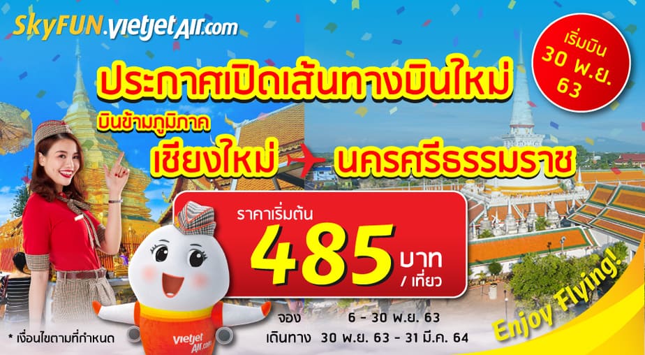สายการบินไทยเวียตเจ็ท เปิดเส้นทางบินใหม่ บินตรงจาก เชียงใหม่ สู่ นครศรีธรรมราช ชวนเที่ยวเมืองคอน ขอพรไอ้ไข่ ไปเที่ยวหาดสิชล สักการะวัดพระมหาธาตุ ชมธรรมชาติหมู่บ้านคีรีวง เริ่มต้นเพียงเที่ยวละ 485 บาท เริ่มบิน 30 พฤศจิกายน นี้ จองได้ตลอดเดือนพฤศจิกายน ถึงมีนาคมปีหน้า จองเลยที่ Skyfun.vietjetair.com (สกายฟัน ดอท เวียตเจ็ทแอร์ ดอทคอม)