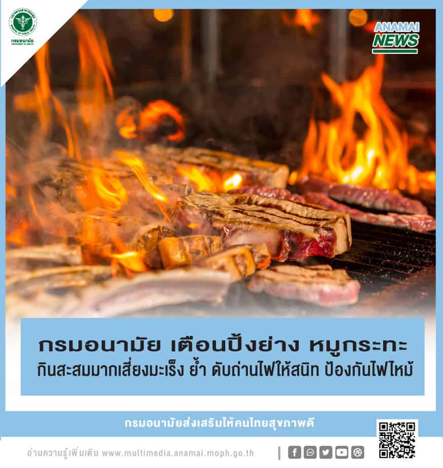 กรมอนามัย กระทรวงสาธารณสุข เตือนประชาชนกินอาหารปิ้ง ย่าง หรืออาหารประเภทรมควันไหม้เกรียมรวมทั้งหมูกระทะเป็นประจำสะสมนานเสี่ยงได้รับสารอันตราย 3 ชนิด ได้แก่ สารไนโตรซามีน สารพัยโรลัยเซต และกลุ่มสารพีเอเอช ที่ก่อให้เกิดโรคมะเร็ง พร้อมแนะวิธีกินปิ้งย่างอย่างถูกต้อง และขอความร่วมมือนักท่องเที่ยว แบบแคมป์ปิ้ง กางเต้นท์ ปรุงอาหารด้วยเมนูปิ้งย่าง หมูกระทะ ต้องตรวจสอบให้มั่นใจว่ามีการดับถ่านไฟจนสนิท ป้องกันอันตรายจากไฟไหม้บริเวณที่พัก