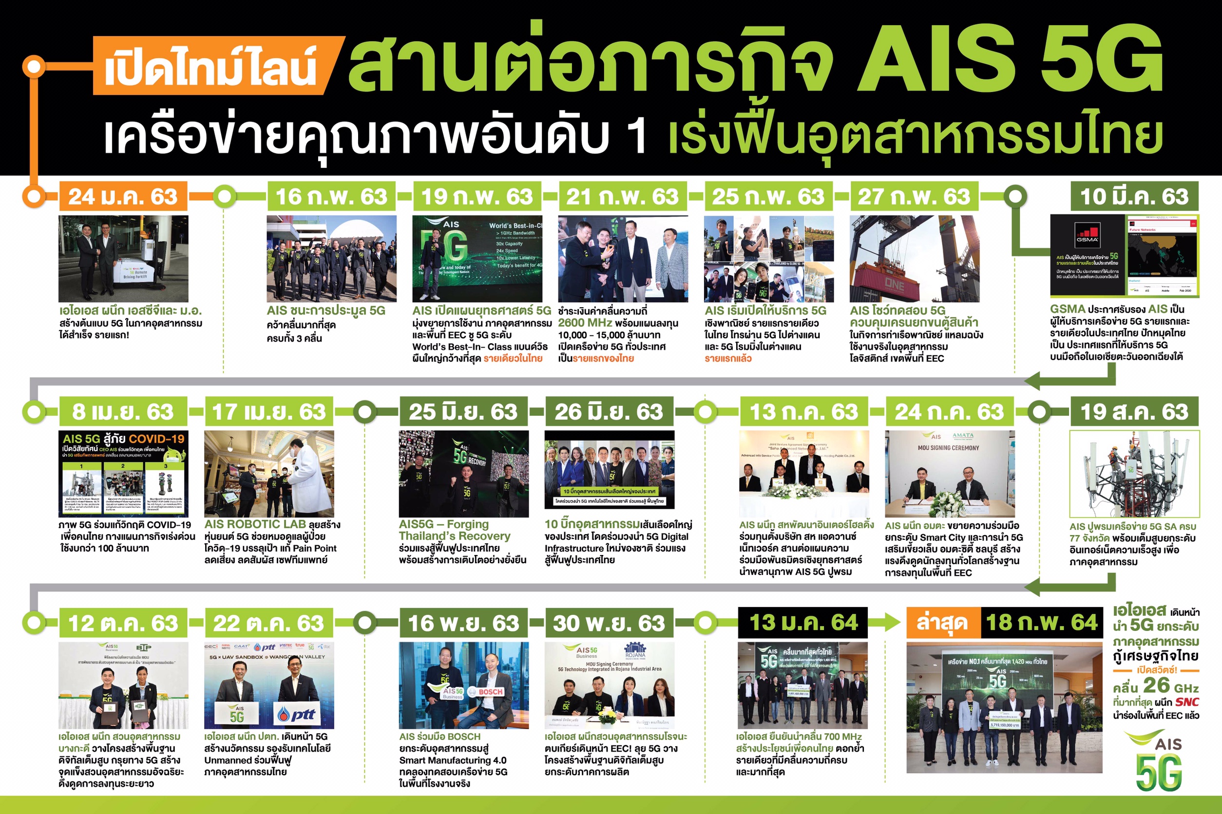 ทั้งนี้ ตลอดปี 2563 ที่ผ่านมา เอไอเอส เดินหน้าผนึกผู้นำอุตสาหกรรมระดับประเทศ อย่างสหพัฒนาอินเตอร์โฮลดิ้ง ในการร่วมทุนตั้งบริษัท สห แอดวานซ์ เน็ทเวอร์ค พัฒนาด้าน ICT Infrastructure และเทคโนโลยี 5G, อมตะ คอร์ปอเรชัน ร่วมพัฒนาเมืองอัจฉริยะ (Smart City), สวนอุตสาหกรรมบางกะดี พัฒนาสวนอุตสาหกรรมอัจฉริยะ, สวนอุตสาหกรรมโรจนะ ในการยกระดับภาคการผลิต และ ปตท. ส่งเสริมการใช้เทคโนโลยี 5G สร้างนวัตกรรม Unmanned ภายในพื้นที่วังจันทร์วัลเลย์ จ.ระยอง โดยล่าสุด ได้ร่วมกับ เอส เอ็น ซี ฟอร์เมอร์ (SNC) ผู้ผลิตกลุ่มชิ้นส่วนยานยนต์ และเครื่องใช้ไฟฟ้าชั้นนำของประเทศในพื้นที่ EEC นำเทคโนโลยี 5G มาช่วยเพิ่มประสิทธิภาพด้านการผลิตภายในโรงงาน โดยที่ผ่านมาได้ร่วมทดลองการใช้งานบนคลื่นความถี่ 26 GHz แล้วและประสบความสำเร็จอย่างดียิ่ง พร้อมเป็นต้นแบบของการยกระดับภาคอุตสาหกรรมไทยสู่การเป็น Digital Industrial ต่อไป