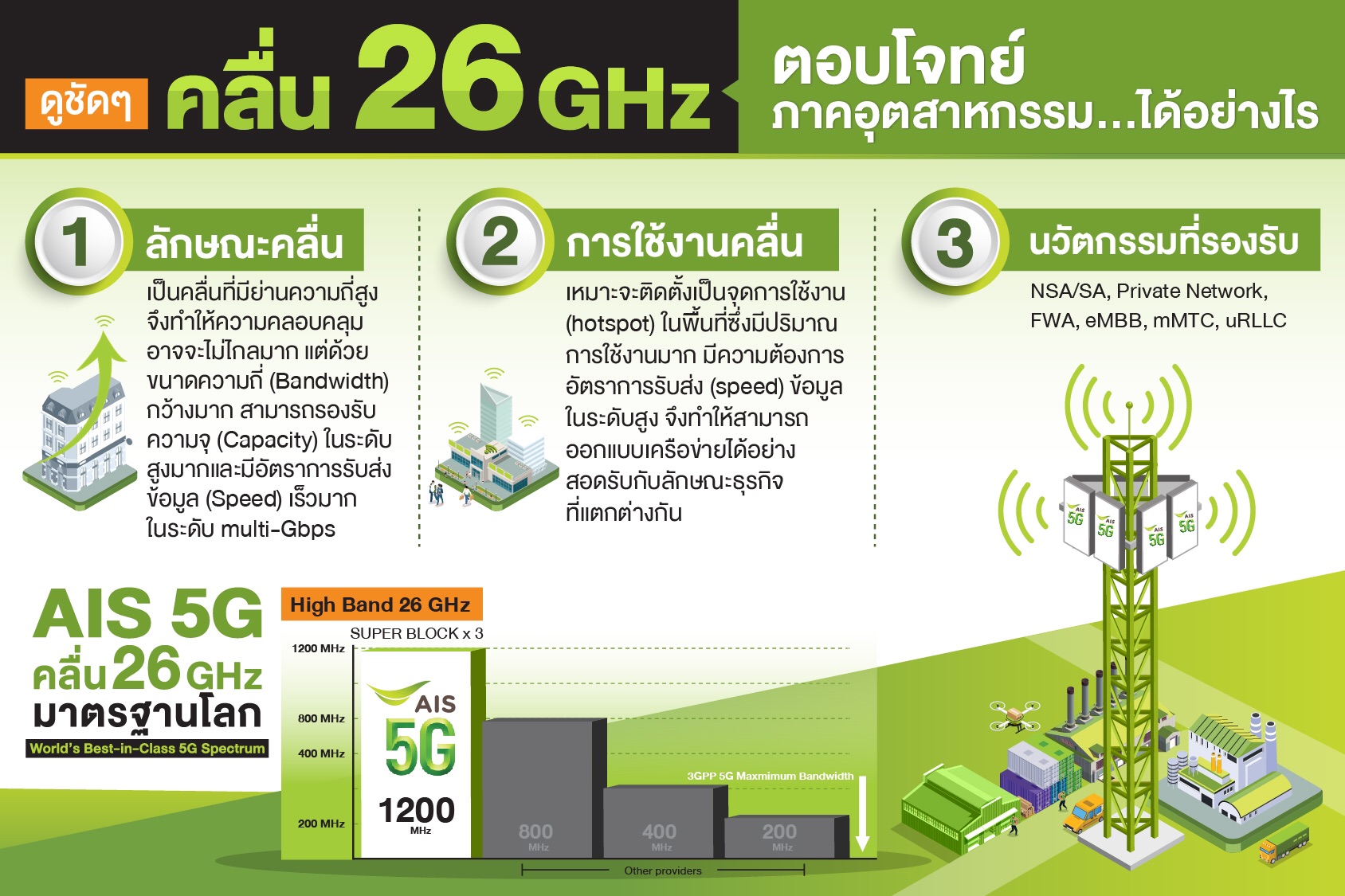 – เนื่องจากเป็นย่านความถี่สูงและมีปริมาณแบนด์วิธมากที่สุด มีความสามารถในการรองรับการใช้งานได้มหาศาล จึงทำให้ลงเครือข่ายได้อย่างเฉพาะเจาะจงในพื้นที่ของแต่ละโรงงาน อย่างไม่ต้องกังวลเรื่องการกวนกันของคลื่นสัญญาณ