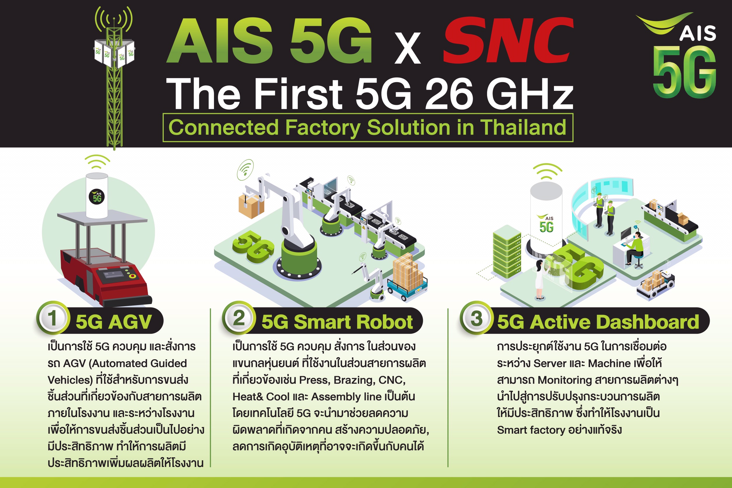 นายสมชาย งามกิจเจริญลาภ รองประธานกรรมการบริหาร บริษัท เอสเอ็นซี ฟอร์เมอร์ จำกัด (มหาชน) กล่าวว่า “ตลอดหลายปีที่ผ่านมา เอส เอ็น ซี ฟอร์เมอร์ ในฐานะผู้ผลิตชิ้นส่วนยานยนต์ และเครื่องใช้ไฟฟ้า เรามุ่งมั่นในการปรับระบบการผลิตให้มีความยืดหยุ่นทันต่อสภาพแวดล้อมที่เปลี่ยนแปลงอย่างรวดเร็ว โดยเฉพาะปี 2563 ที่ภาคอุตสาหกรรมไทยต่างได้รับผลกระทบจาก COVID-19 ด้วยเหตุนี้ เทคโนโลยี จึงมีส่วนสำคัญอย่างมากในการเชื่อมต่อให้ธุรกิจเดินหน้าต่อไปได้ โดยเอไอเอส ถือเป็นพาร์ทเนอร์ชั้นนำของประเทศที่มีความพร้อมด้วยโครงสร้างพื้นฐานทางดิจิทัล โดยเฉพาะเทคโนโลยี 5G ที่เข้ามาช่วยตอบโจทย์ภาคการผลิตได้อย่างลงตัว โดยปัจจุบัน ได้มีการประยุกต์ใช้ใน 3 ส่วนหลัก ได้แก่ 1. 5G AGV เป็นการใช้ 5G ควบคุม และสั่งการรถ AGV (Automated Guided Vehicles) ที่ใช้สำหรับการขนส่งชิ้นส่วนที่เกี่ยวข้องกับสายการผลิตภายในโรงงาน และระหว่างโรงงาน เพื่อให้การขนส่งชิ้นส่วนเป็นไปอย่างมีประสิทธิภาพ ทำให้การผลิตมีประสิทธิภาพ เพิ่มผลผลิตให้โรงงาน 2. 5G Smart Robot เป็นการใช้ 5G ควบคุม สั่งการ ในส่วนของ แขนกลหุ่นยนต์ (Robot) ที่ใช้งานในส่วนสายการผลิตที่เกี่ยวข้องเช่น Press, Brazing, CNC, Heat& Cool และ Assembly line เป็นต้น โดยเทคโนโลยี 5G จะนำมาช่วยลดความผิดพลาดที่เกิดจากคน (Human error) และช่วยสร้างความปลอดภัย, ลดการเกิดอุบัติเหตุที่อาจจะเกิดขึ้นกับคนได้ 3. 5G Active Dashboard การประยุกต์ใช้งาน 5G ในการเชื่อมต่อระหว่าง Server และ Machine เพื่อให้สามารถ Monitoring สายการผลิตต่างๆ นำไปสู่การปรับปรุงกระบวนการผลิตให้มีประสิทธิภาพ ซึ่งทำให้โรงงานเป็น Smart factory อย่างแท้จริง”