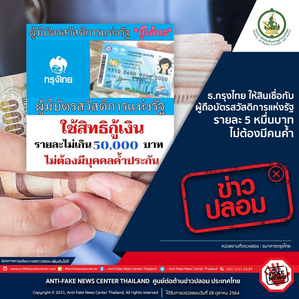 กรณีที่มีการเผยแพร่ข้อมูลเรื่องสินเชื่อ เกี่ยวกับประเด็นเรื่อง ธ.กรุงไทย ให้สินเชื่อกับผู้ถือบัตรสวัสดิการแห่งรัฐ รายละ 5 หมื่นบาท ไม่ต้องมีคนค้ำ ทางศูนย์ต่อต้านข่าวปลอมได้ดำเนินการตรวจสอบข้อเท็จจริงโดย ธนาคารกรุงไทย พบว่าประเด็นดังกล่าวนั้น เป็นข้อมูลเท็จ