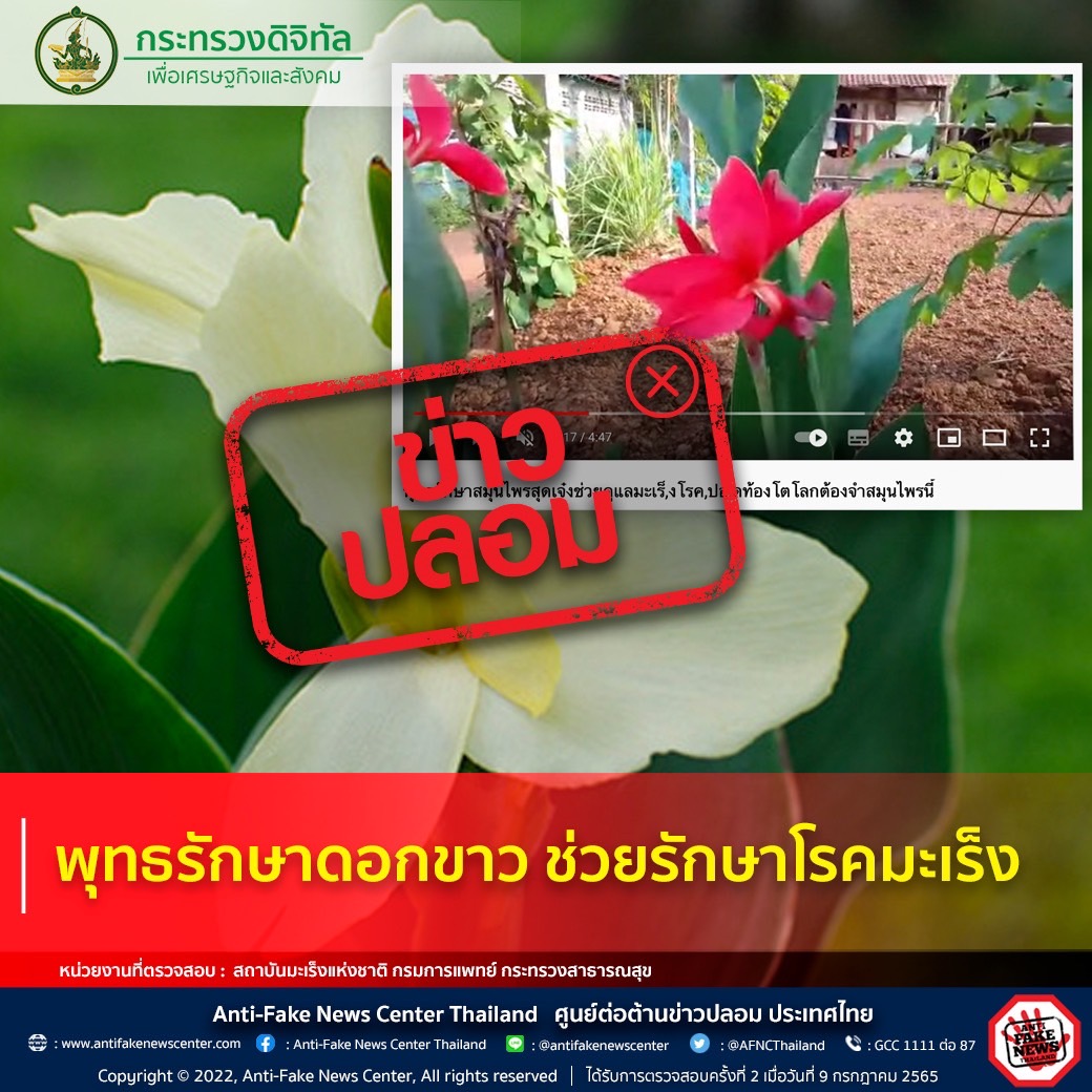 กรณีที่มีคลิปวิดีโอเผยแพร่ข้อมูลเกี่ยวกับเรื่องพุทธรักษาดอกขาว ช่วยรักษาโรคมะเร็ง ทางศูนย์ต่อต้านข่าวปลอม กระทรวงดิจิทัลเพื่อเศรษฐกิจและสังคม ได้ดำเนินการตรวจสอบข้อเท็จจริงโดยสถาบันมะเร็งแห่งชาติ กรมการแพทย์ กระทรวงสาธารณสุข พบว่าประเด็นดังกล่าวนั้น เป็นข้อมูลเท็จ