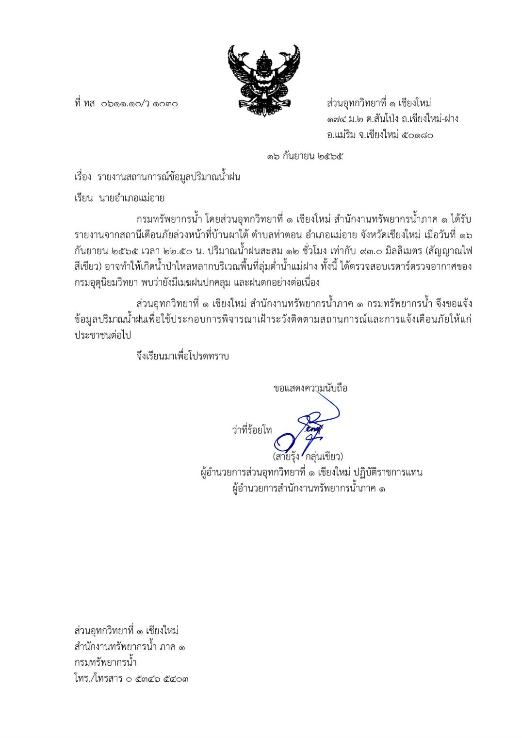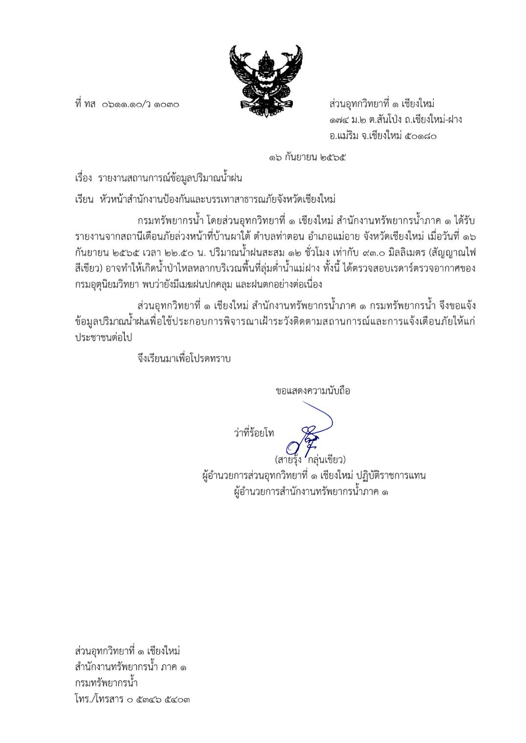 ทั้งนี้ ได้ตรวจสอบเรดาร์ตรวจอากาศของกรมอุตุนิยมวิทยา พบว่ายังมีเมฆฝนปกคลุม และฝนตกอย่างต่อเนื่อง ส่วนอุทกวิทยาที่ 1 เชียงใหม่ สำนักงานทรัพยากรน้ำภาค 1 กรมทรัพยากรน้ำ จึงขอแจ้ง