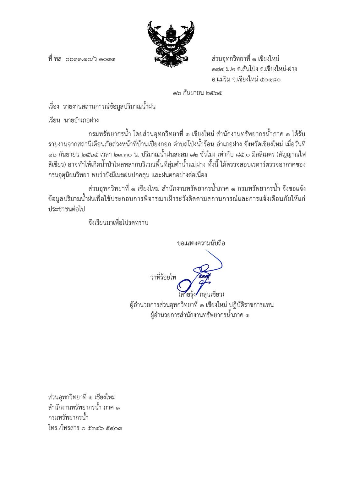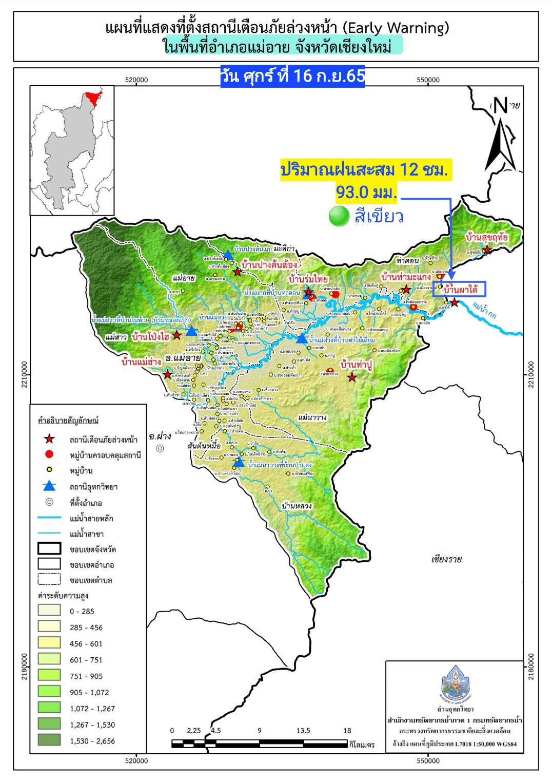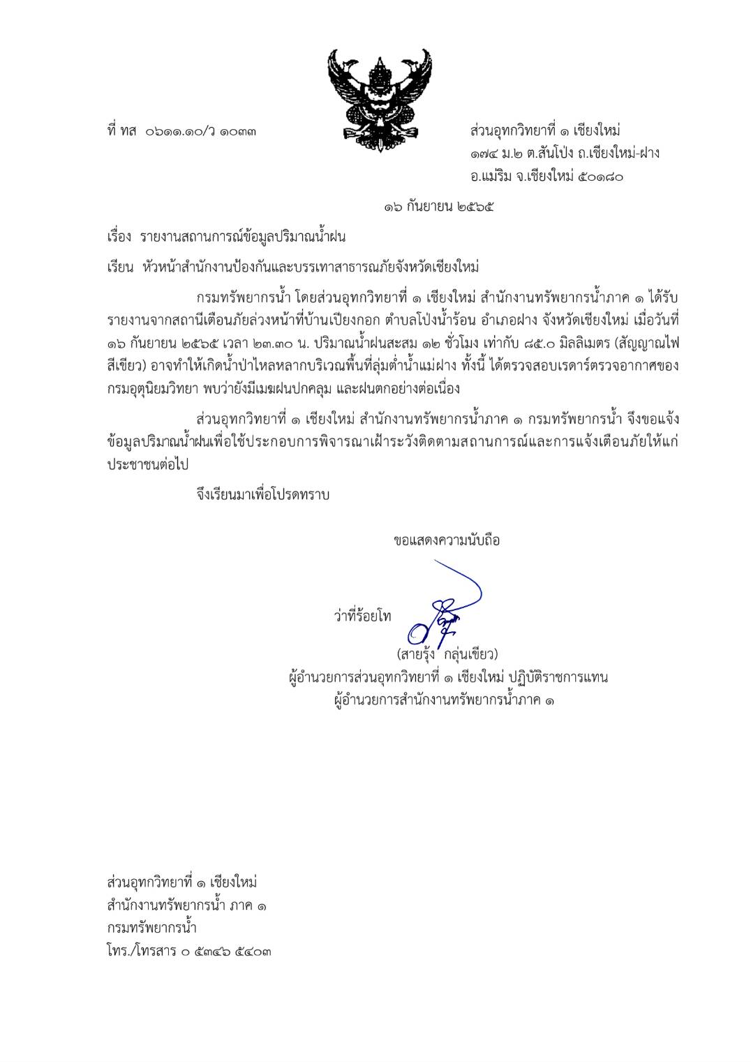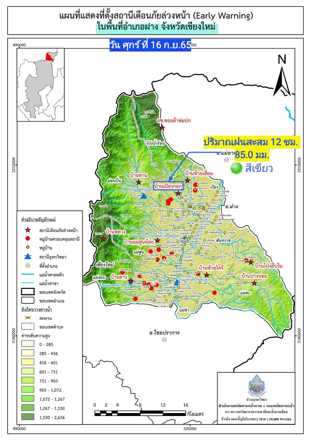 รายงานจากสถานีเตือนภัยล่วงหน้าที่บ้านเปียงกอก ตำบลโป่งน้ำร้อน อำเภอฝาง จังหวัดเชียงใหม่ เมื่อวันที่ 16 กันยายน 2565 เวลา 23.30 น. ปริมาณน้ำฝนสะสม 12 ชั่วโมง เท่ากับ 85.0 มิลลิเมตร (สัญญาณไฟสีเขียว) อาจทำให้เกิดน้ำป่าไหลหลากบริเวณพื้นที่ลุ่มต่ำน้ำแม่ฝาง