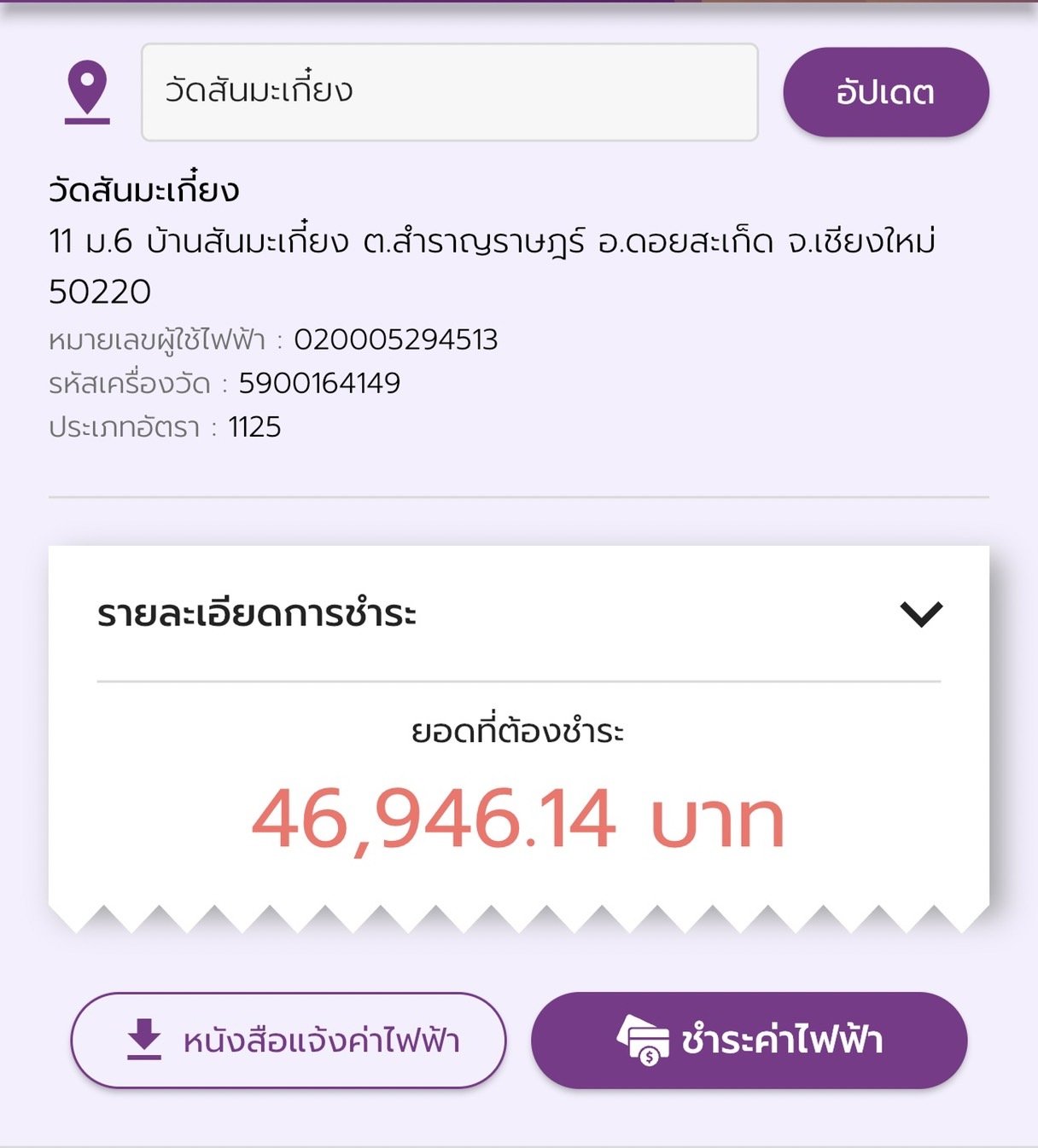 เมื่อวันที่ 30 ก.ย.2565 ผู้สื่อข่าวได้รับแจ้งจากลูกศิษย์ของวัดสันมะเกี๋ยง ต.สำราญราษฏร์ อ.ดอยสะเก็ด จ.เชียงใหม่ แจ้งว่า วันนี้ทางวัดได้ค้างชำระค่าไฟฟ้า จำนวน 2 เดือน คือเดือนสิงหาคม และเดือนกันยายน 2565 ติดหนี้ค่าไฟที่ทางวัดสันมะเกี๋ยงจะต้องจ่ายให้การไฟฟ้าส่วนภูมิภาคจำนวนมาก รวมทั้งสิ้น จำนวน 46,946.14 บาท